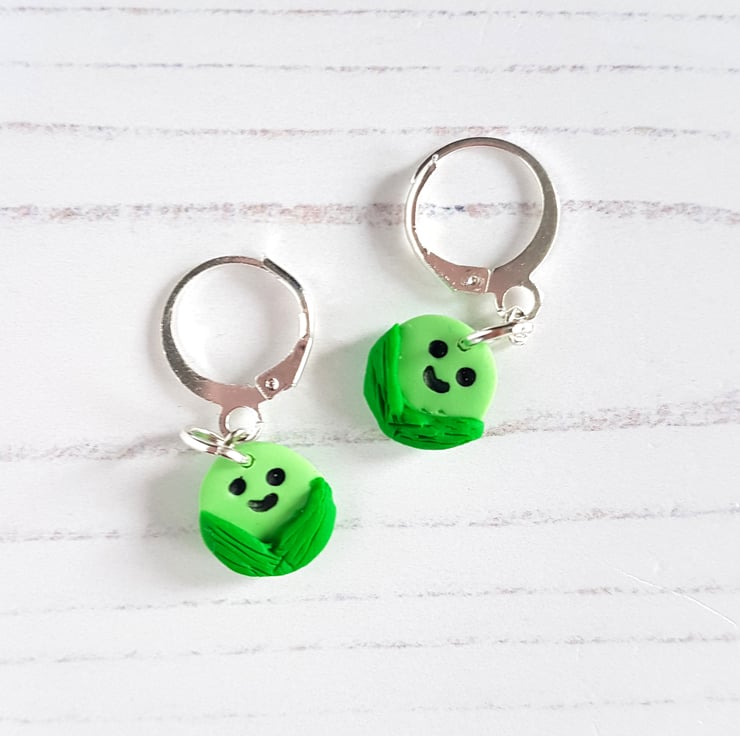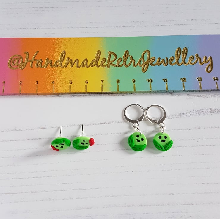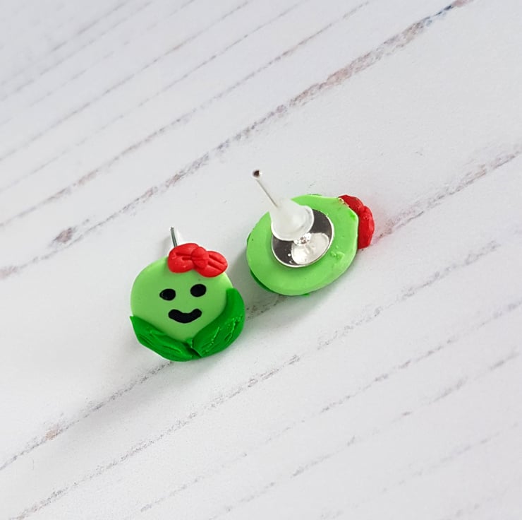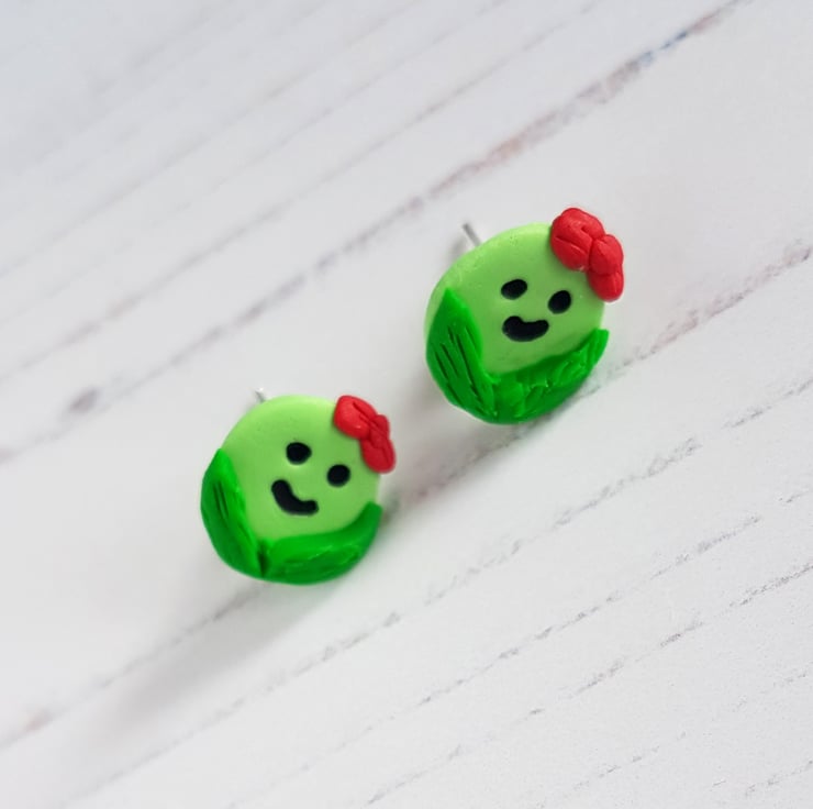 Some very cute mini smiley green Brussel Sprout earrings, choose from boy or girl versions with a red hair bow!