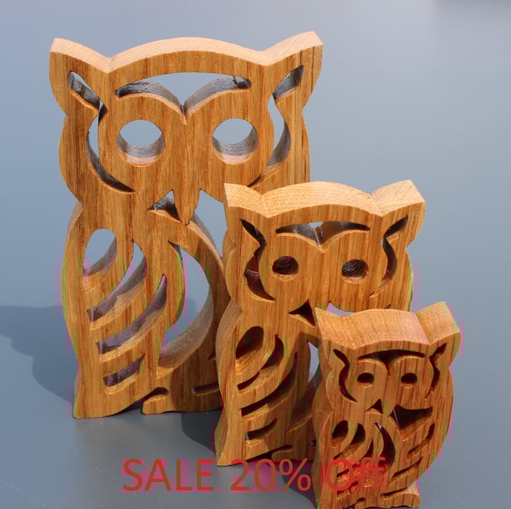 A family of three owls made from oak, finished to a satin sheen. Each owl is 20mm thick allowing it to easily stand upright