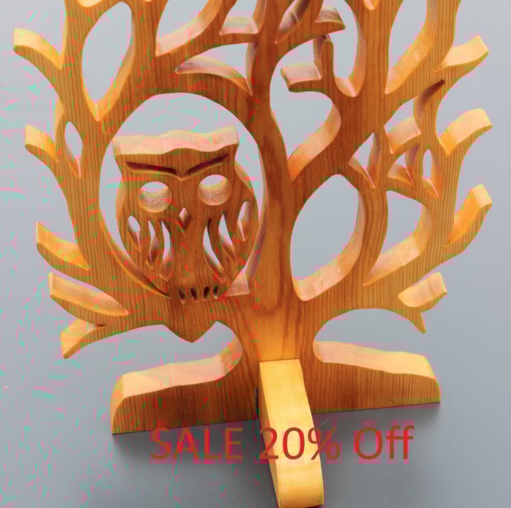 An ornamental 'Owl in a Tree' an ideal gift for all those who love owls. The tree is made from one piece of solid pine and finished in a durable satin varnish. A detachable base allows the tree to be freestanding.