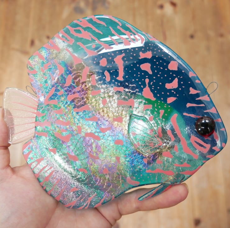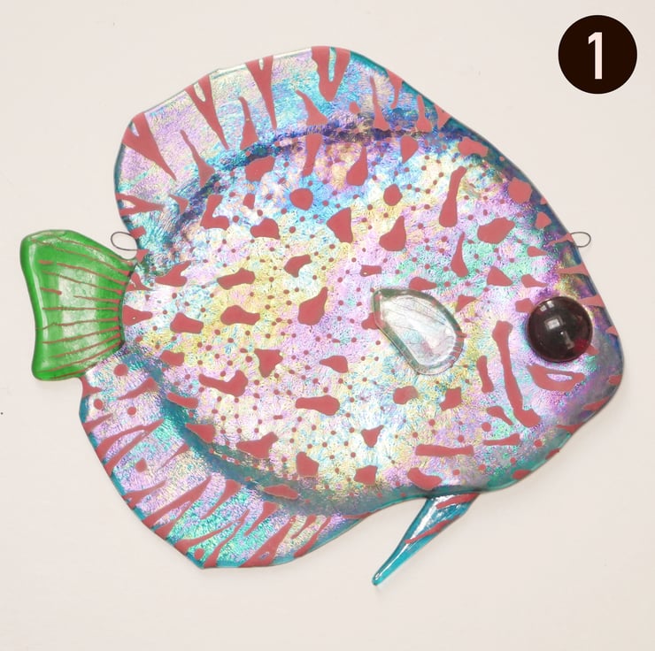 These fused glass fish feature discus, and work equally well as sun catchers or pieces of wall art. Suitable for inside or outdoor spaces, the fish are made from luminescent glass, which creates a vivid metallic sheen in certain lights.