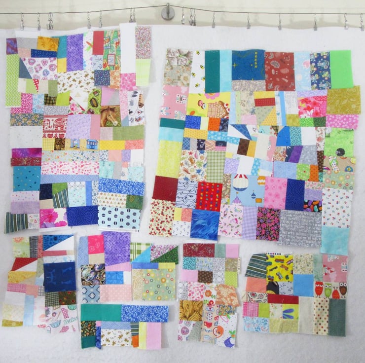 I found all these pieces of fabric in my sewing room. I really enjoyed stitching them together especially finding the little images of animals and objects peeping out from so many of the odd shaped pieces. It certainly was a puzzle up on my design wall!