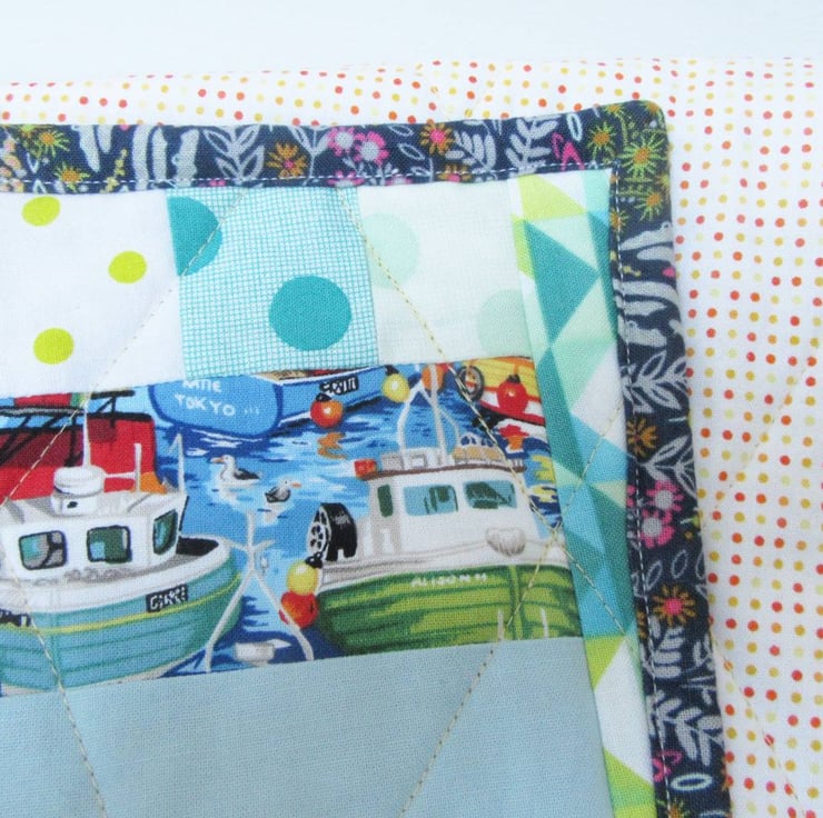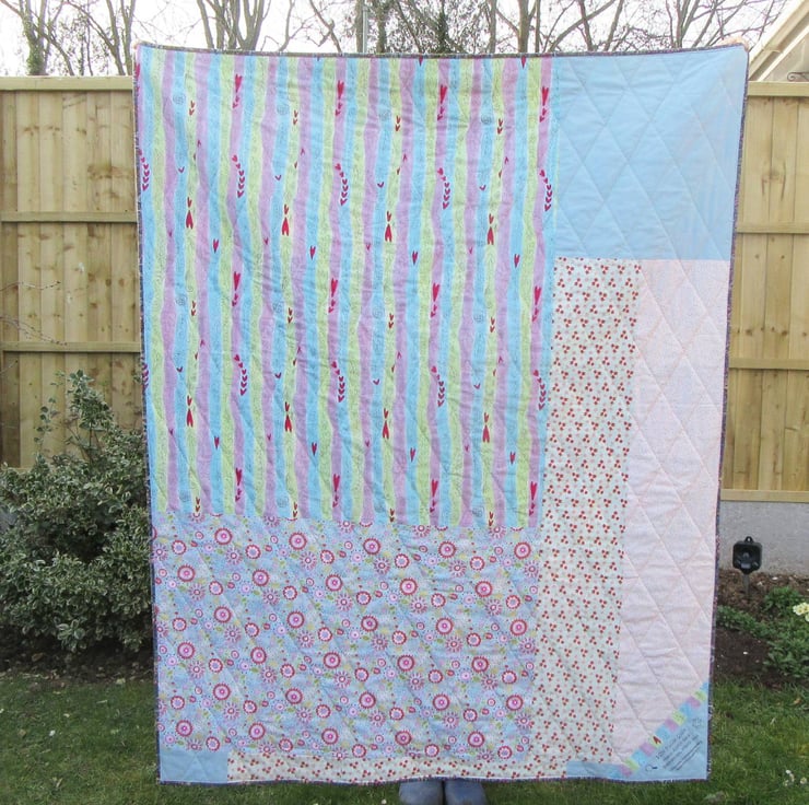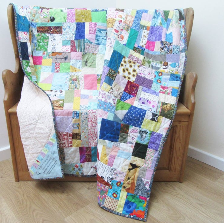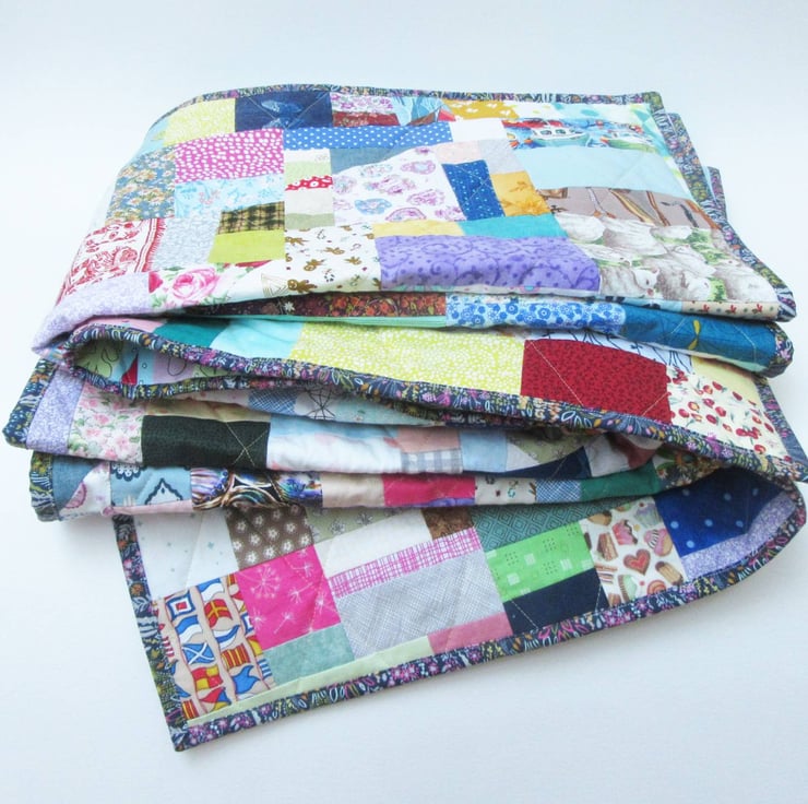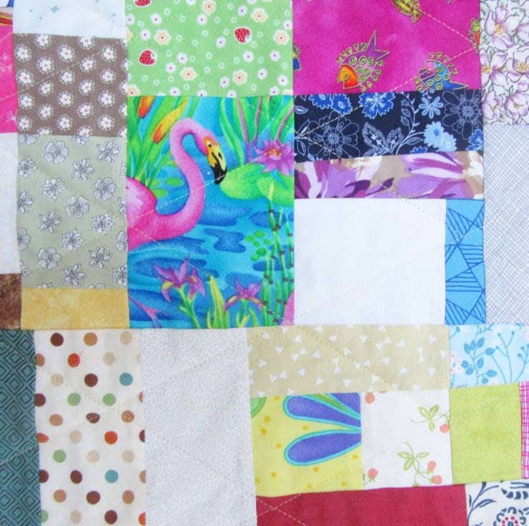 The patchwork front and back as well as the binding around the edge of the quilt are all quilting weight 100% cotton. Inside the quilt is a soft, warm layer of Hobbs 80% cotton, 20% polyester wadding. I've quilt stitched all three layers together with a decorative diamond grid.