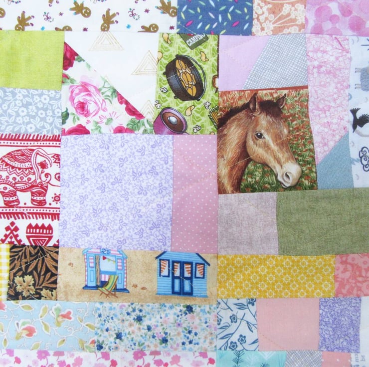 A fun patchwork quilt made of hundreds of pieces of bright cotton prints. Many of the prints contain images of animals and objects - ideal for a game of I-Spy or 'find the picture'.