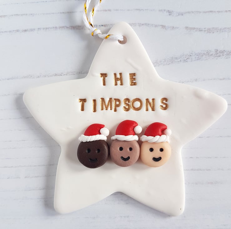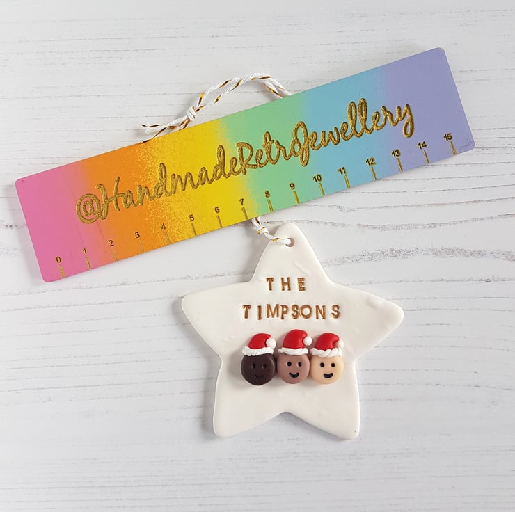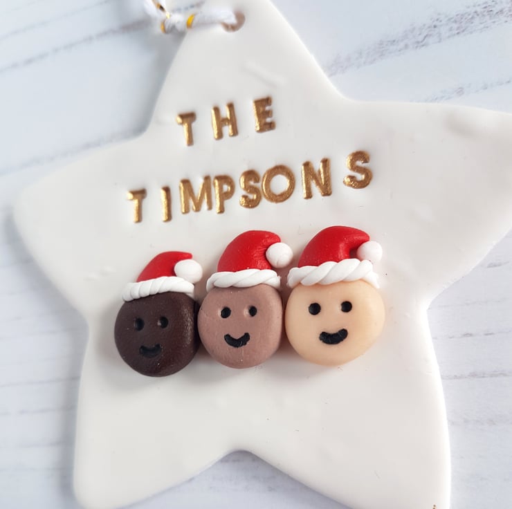 This gorgeous hanging decoration made from polymer clay includes smiley faces wearing Santa hats to represent the members of your family! Your family name is also hand stamped into the clay using individual letters, then painted in gold using acrylic paint. Cut into a star shape, this is perfect as a tree decoration too!