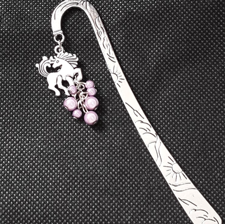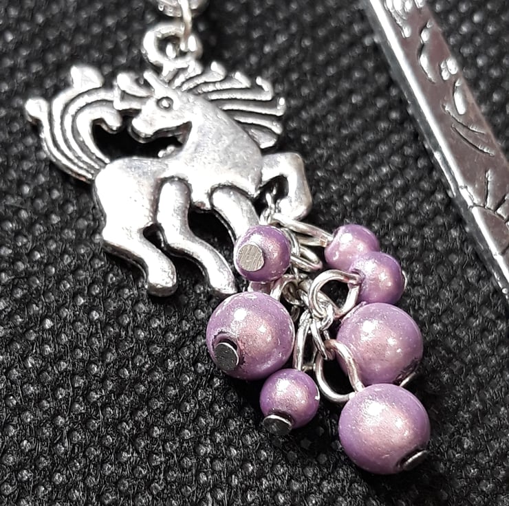 Cute unicorn dangles along the spine of the book with its collection of purple miracle beads shimmering in the light while the silver finished shaft sits comfortably between the pages of any book.