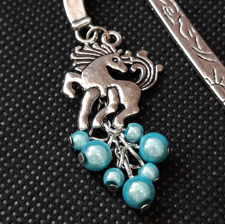 Cute unicorn dangles along the spine of the book with its collection of blue miracle beads shimmering in the light while the silver finished shaft sits comfortably between the pages of any book.