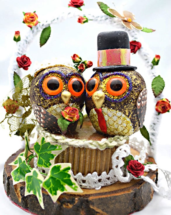 Both the bride and groom sit proudly on layered slices of wood that is adorned with hand made paper flowers, lace and crochet. There is a white archway behind the owls constructed of wire and white pipe cleaners that have had paper roses and rosebuds interwoven into it.