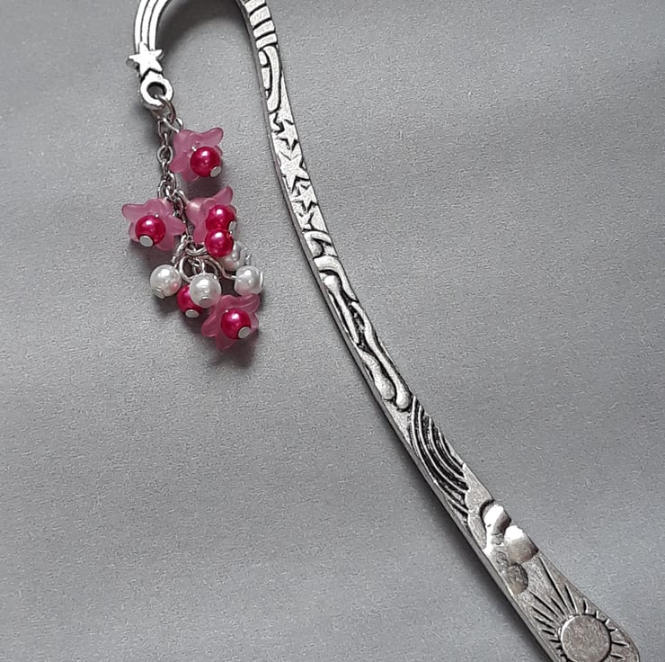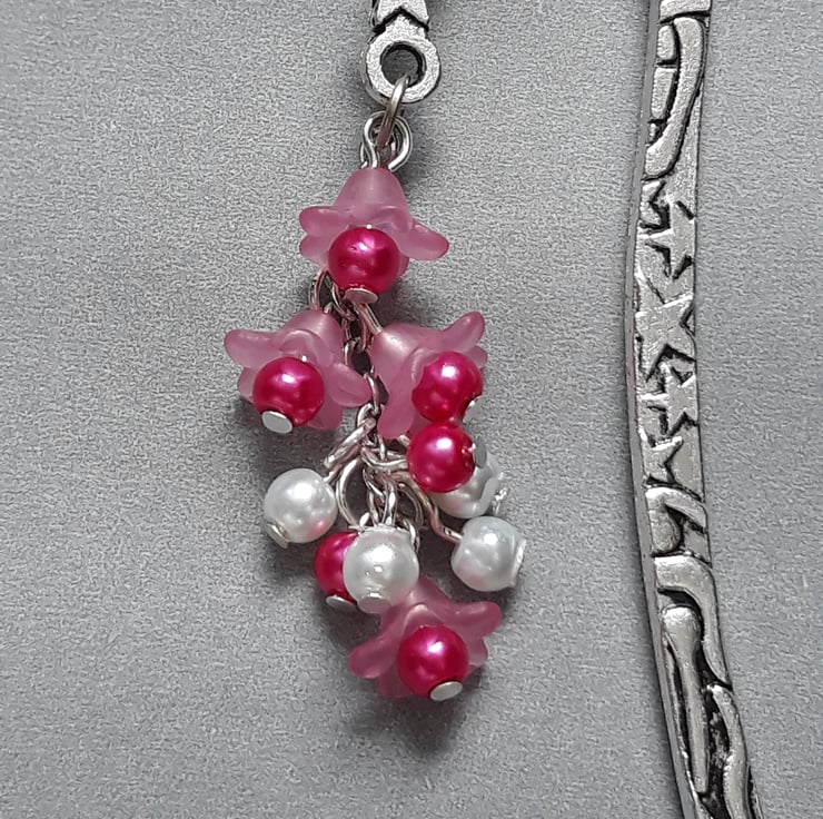 Pretty bookmark with pink and white faux pearls and Lucite flowers that dangle down the spine of any book whilst the metal shaft sits comfortably between the pages.