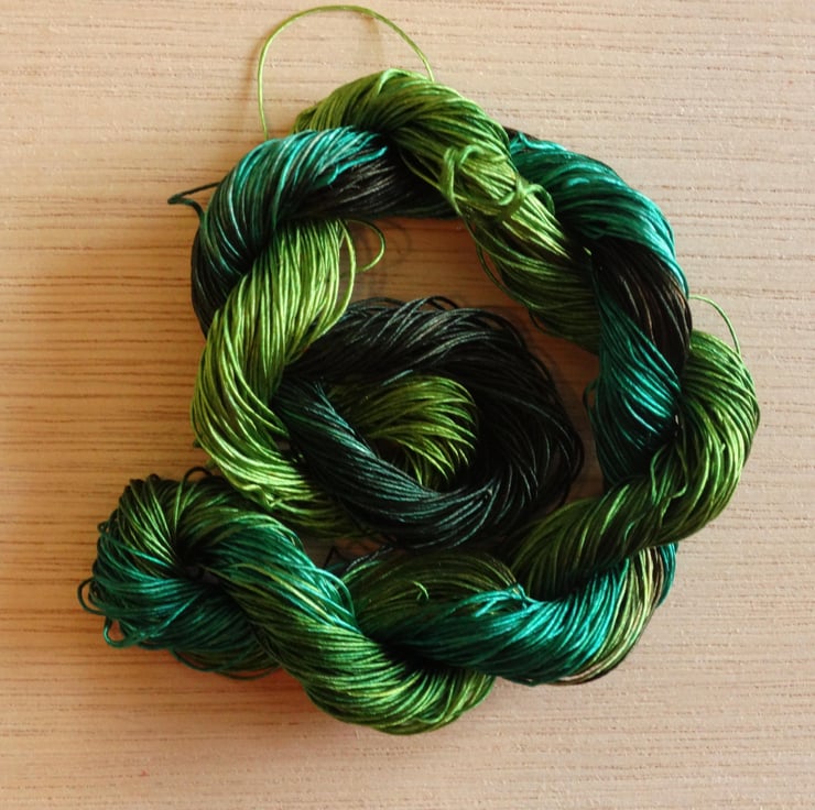 The colours cycle in the order of yellowish green, blueish green, dark green and green (this may be reversed and/or start on a different colour on individual bobbins) with roughly 4 inches of each colour at a time, but as this is handdyed, this isn't an exact measurement. This is a darker variant on the Rolling Hills colourway.