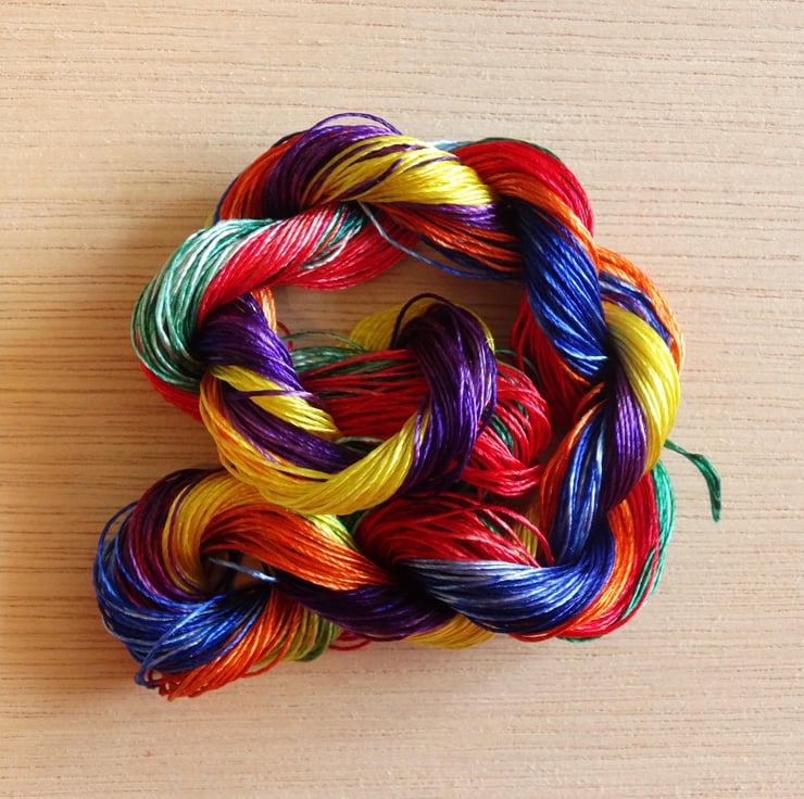 This embroidery thread is made from of 100% Silk and has been handdyed to create a colourful and variegated thread. It is perfect for any form of embroidery including cross-stitch, blackwork and free-hand embroidery. It will be sent already wound onto a bobbin.