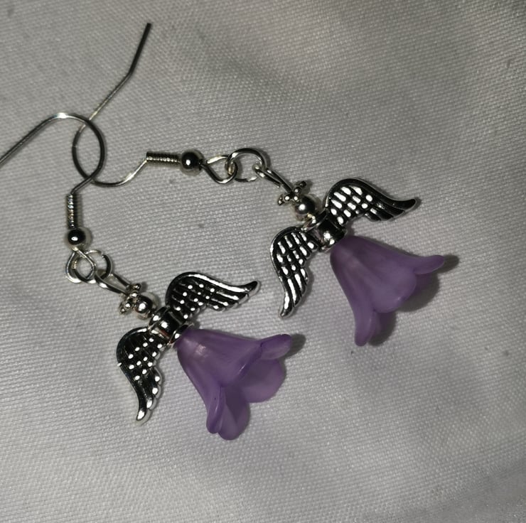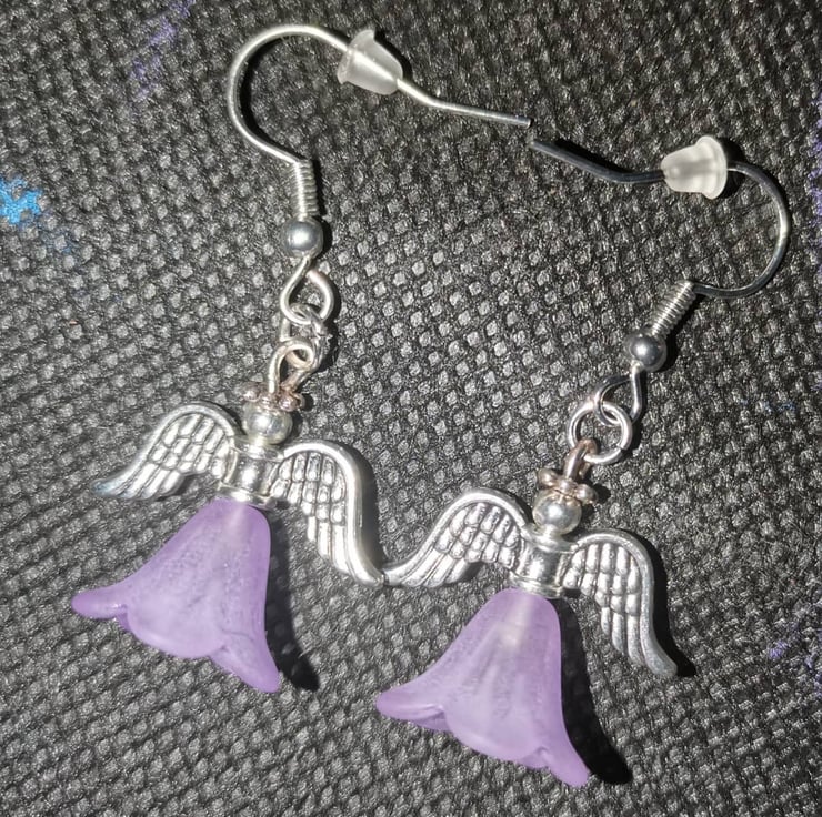 made these gorgeous earrings from a purple tulip for a skirt/dress, little angel wings, a silver round bead for the head and a tiny halo which consists of a small hoop with tiny silver balls attached which I then attached the whole angel to a hook earring