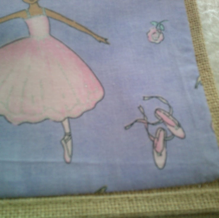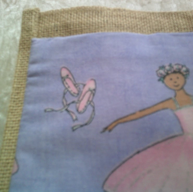 The bag itself measures approximately 22 x 20 x 13 cm (9 x 8 x 5 inches). The fabric pocket - which has been hand sewn onto the bag has a design of a dark skinned ballet dancer in a pink dress and ballet shoes on a lavender background.