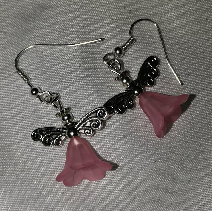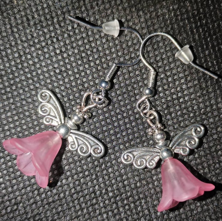 made these gorgeous earrings from a pink tulip for a skirt/dress, little angel wings, a silver round bead for the head and a tiny halo which consists of a small hoop with tiny silver balls attached which I then attached the whole angel to a hook earring