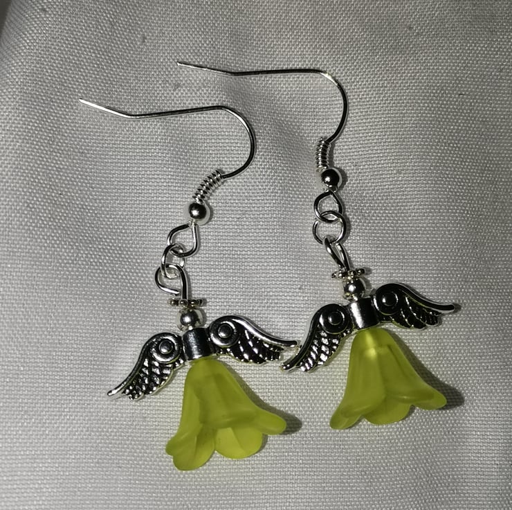 made these gorgeous earrings from a green tulip for a skirt/dress, little angel wings, a silver round bead for the head and a tiny halo which consists of a small hoop with tiny silver balls attached which I then attached the whole angel to a hook earring