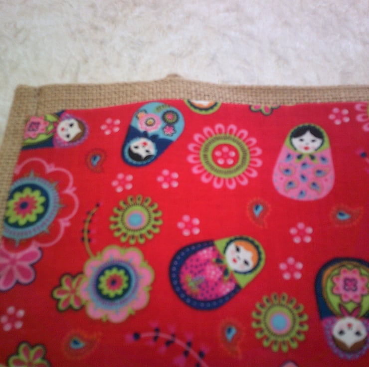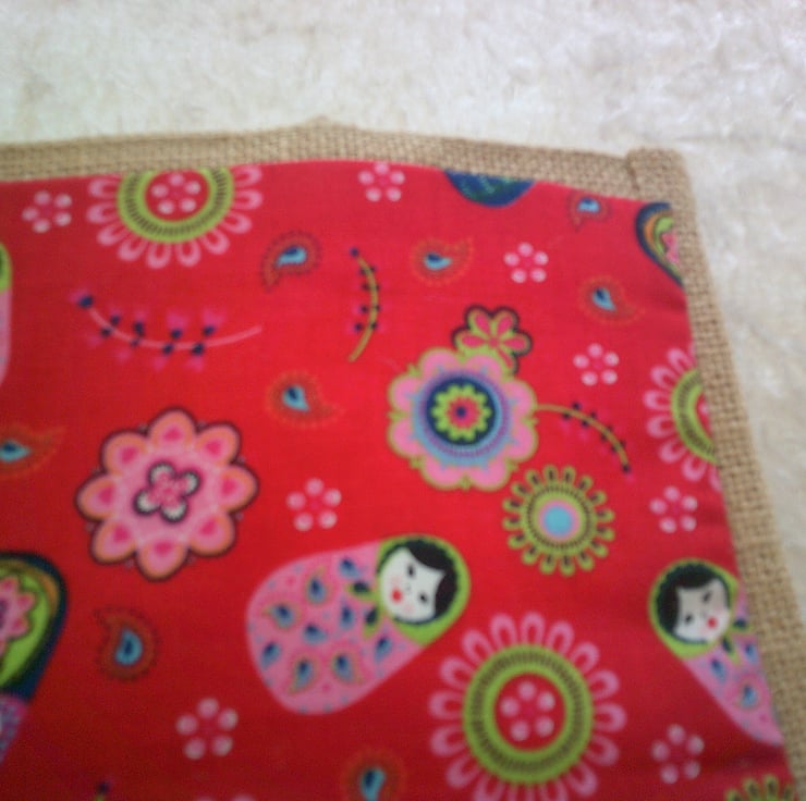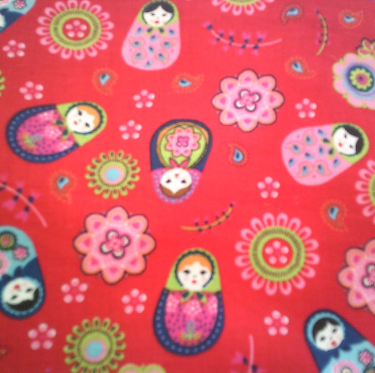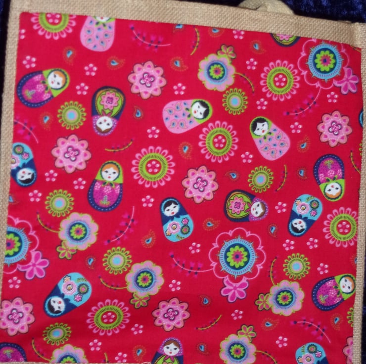 The bag itself measures approximately 30 x 30 x 20 cm (12 x 12 x 8 inches). The fabric pocket - which has been hand sewn onto the bag has a design of Russian Dolls and Flowers on a Red Background.