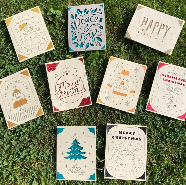 72 Christmas cards in a various assortment cut by a Cricut joy but hand-finished by me