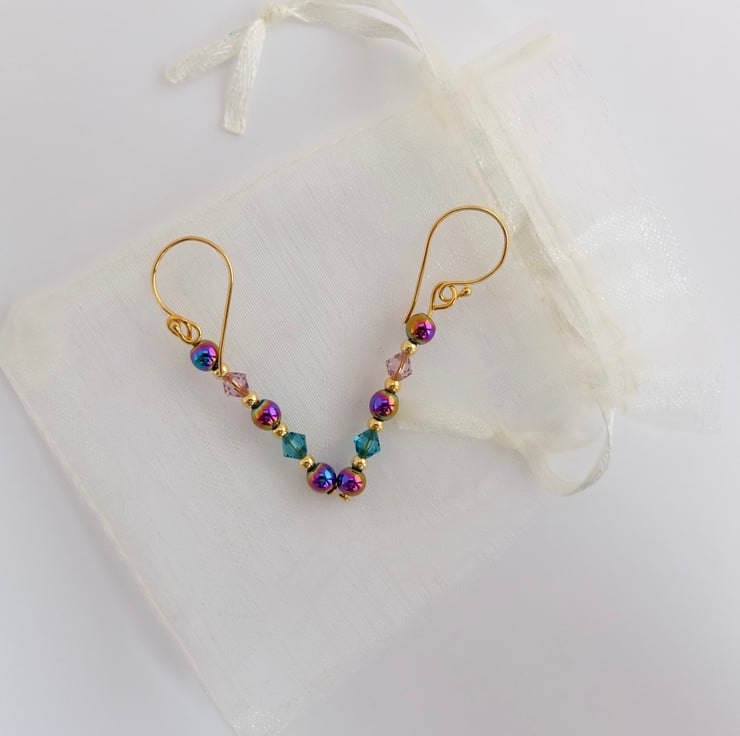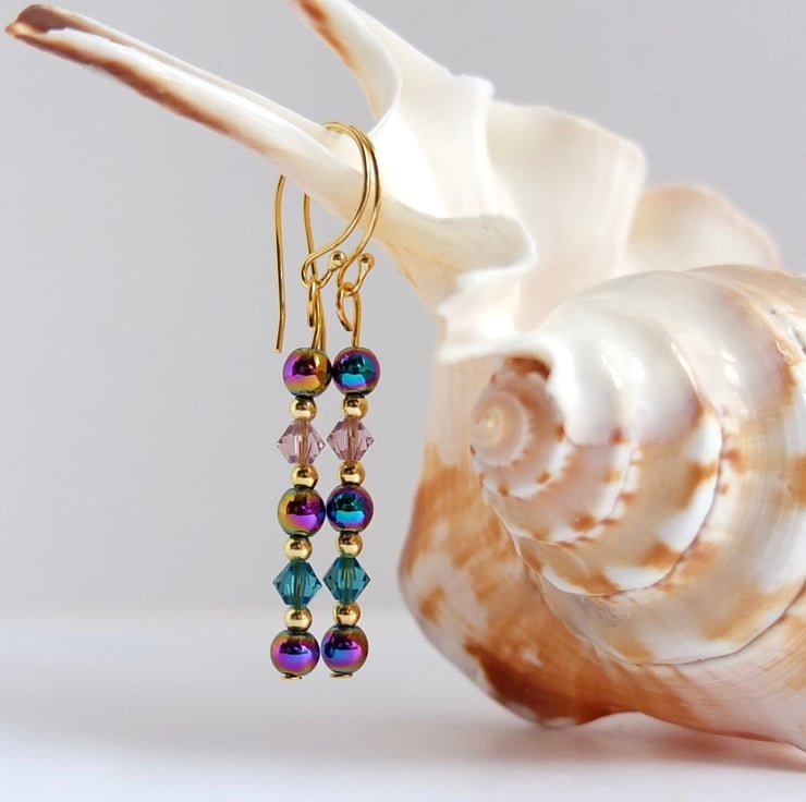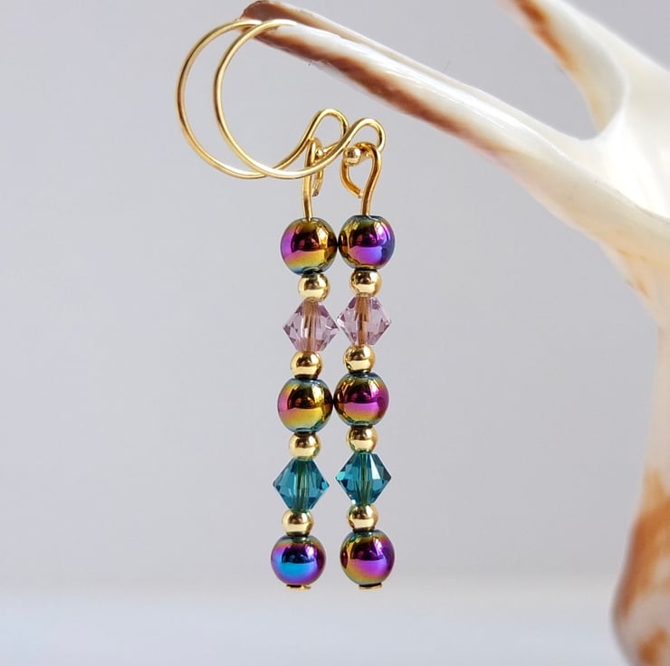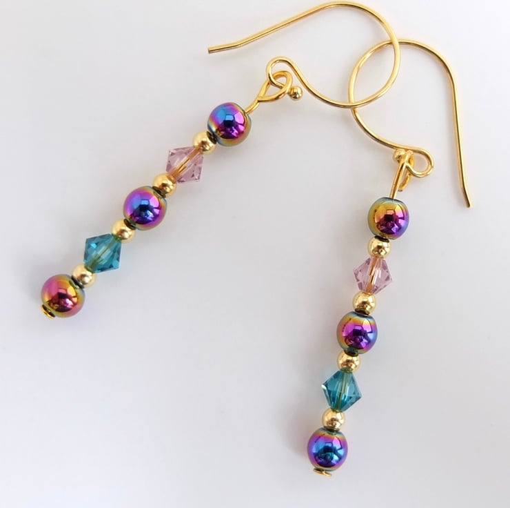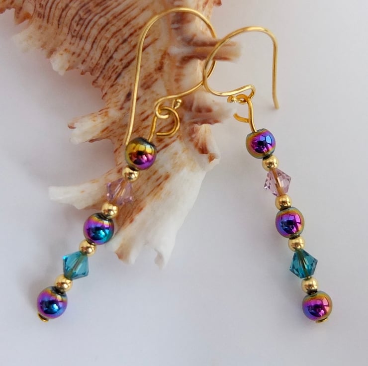 Rainbow hematite beads are separated by Swarovski crystal bicones in the colours "indicolite" and "light amethyst" and small gold vermeil rounds.