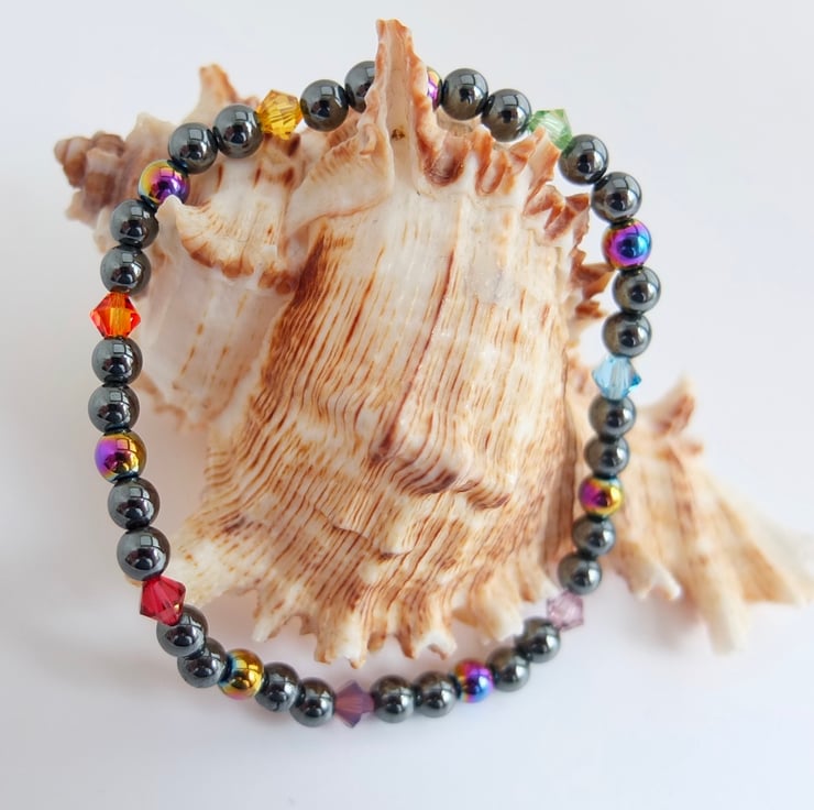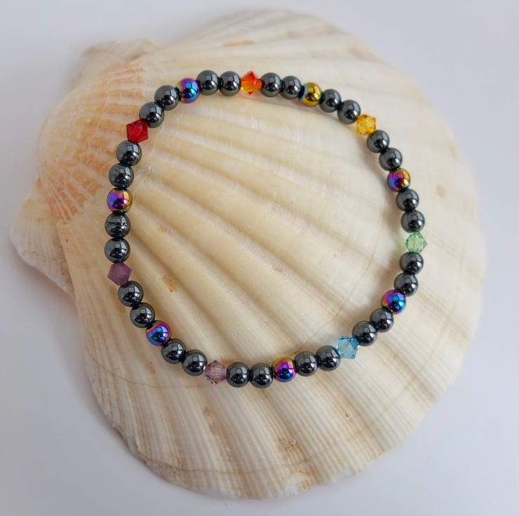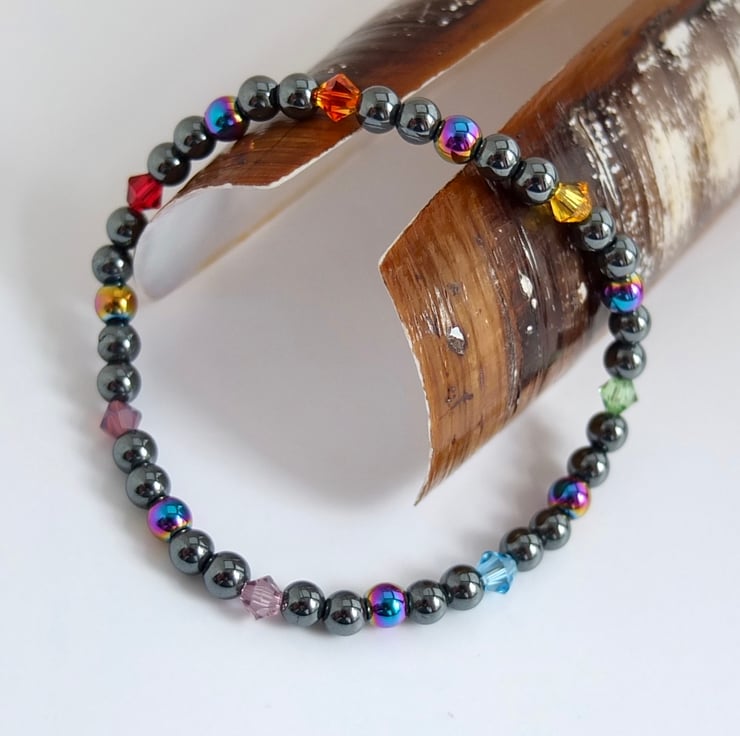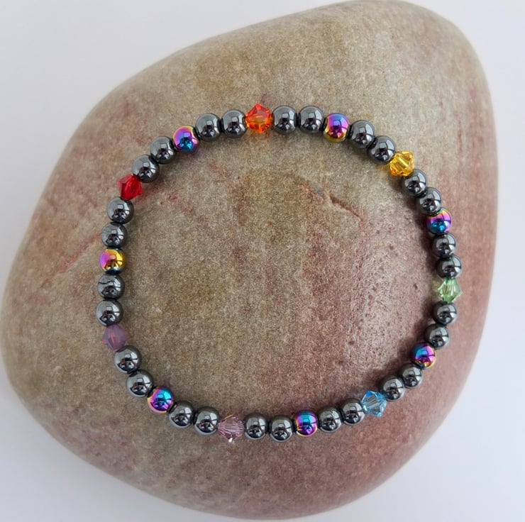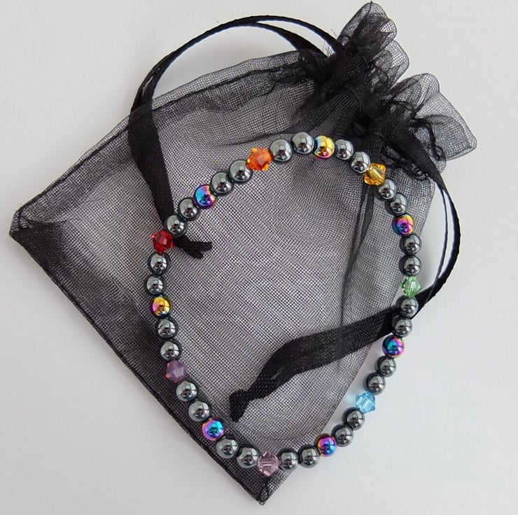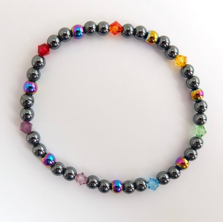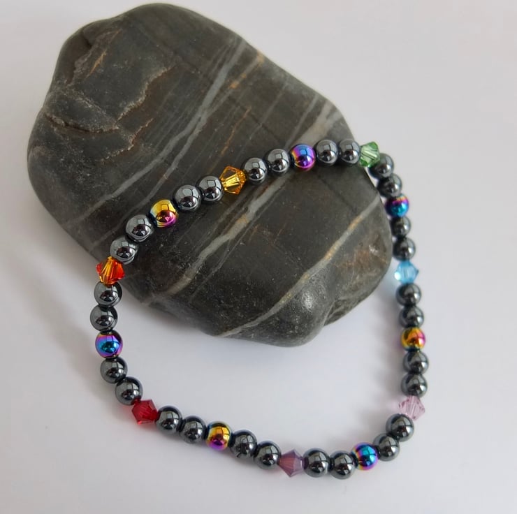 Groups of five hematite beads, the middle one of the five being electroplated to give a metallic rainbow effect, are separated by Swarovski crystals representing the colours of the rainbow.
