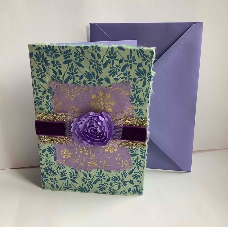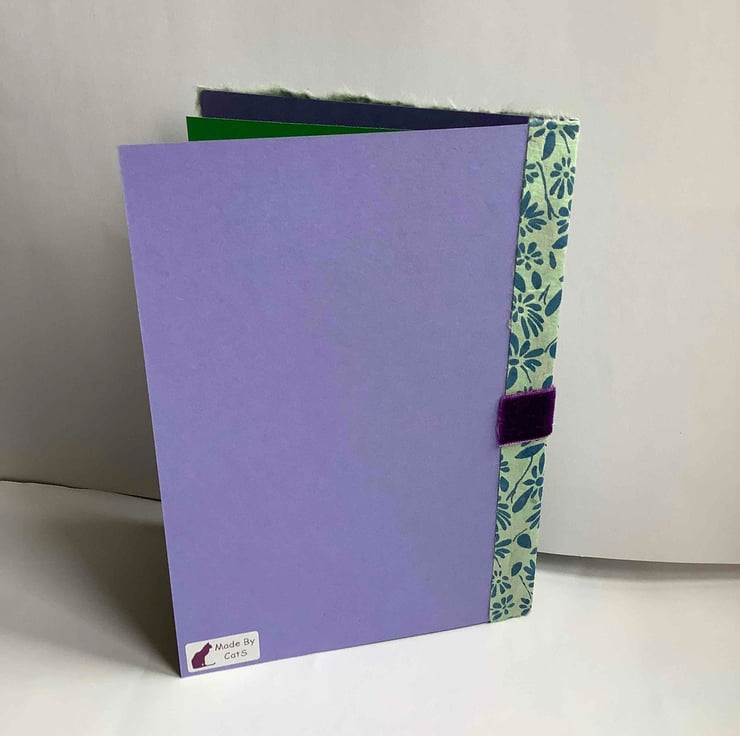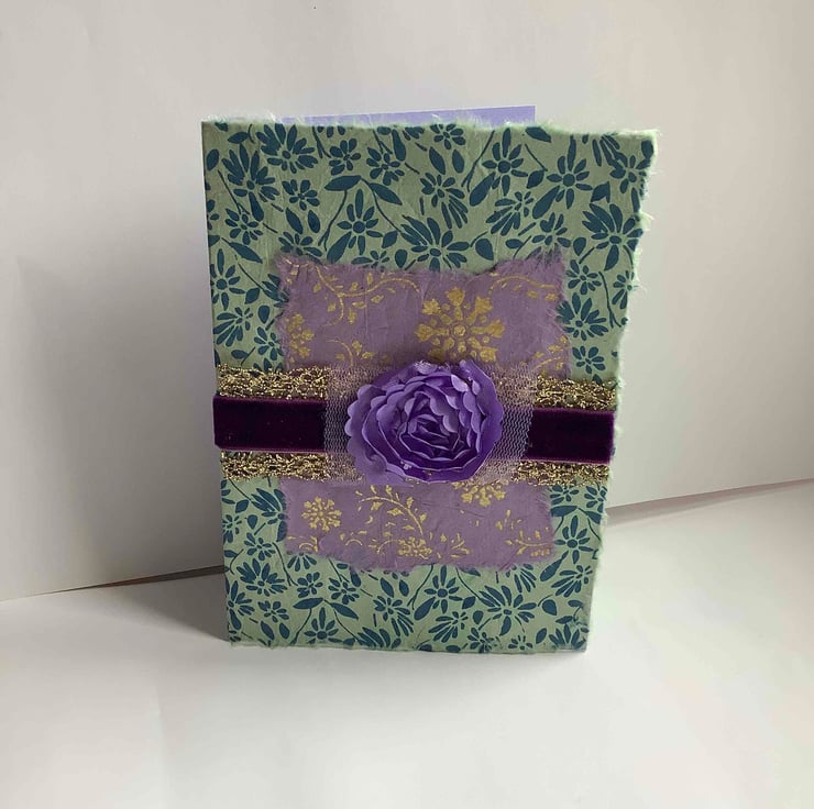 This card is part of the BRIGHT N CHEERY collection. The card itself is purple(and purple envelope) with a green insert which is blank for your own message. A dark/light teal floral leaf paper covers the front of the card with a lilac and gold paper on top.