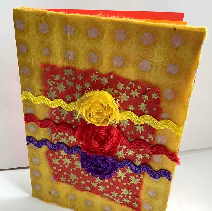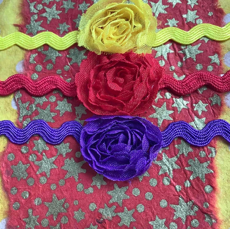 The final decoration consists of yellow, red, and purple braid with matching flowers.