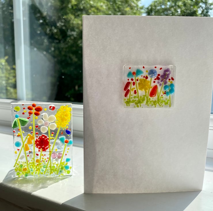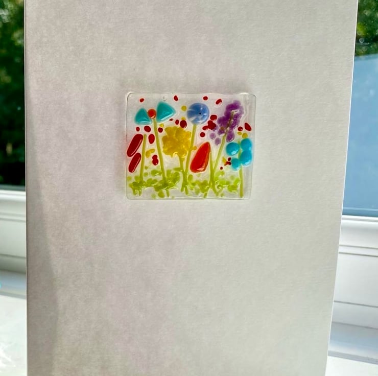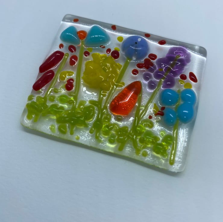 A colourful display of flowers, individually hand cut and fused to a clear glass rectangle measuring 5cm by 4cm.