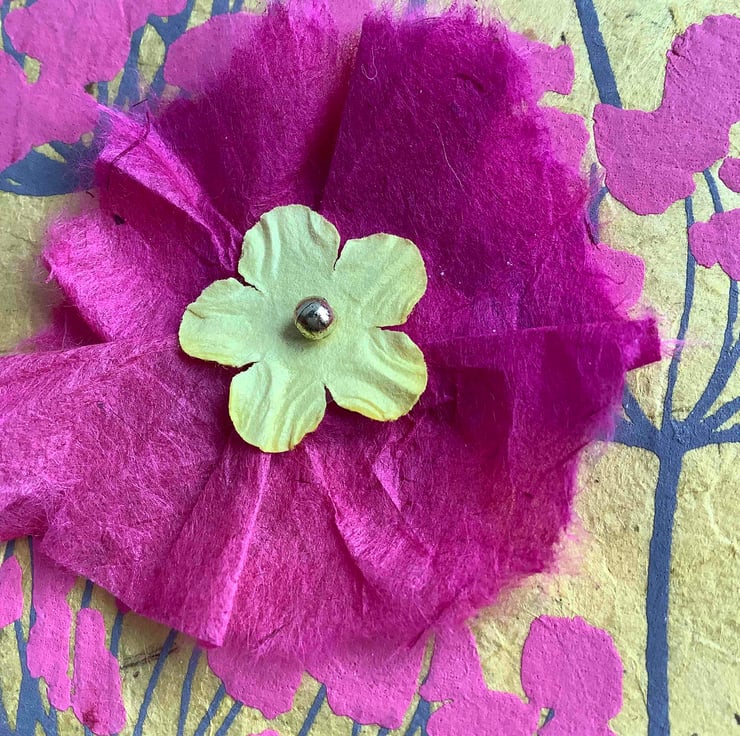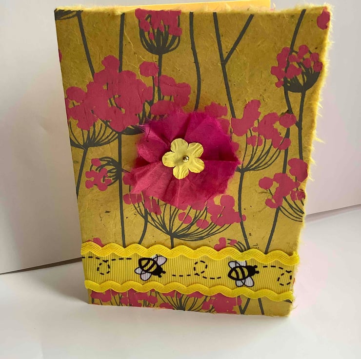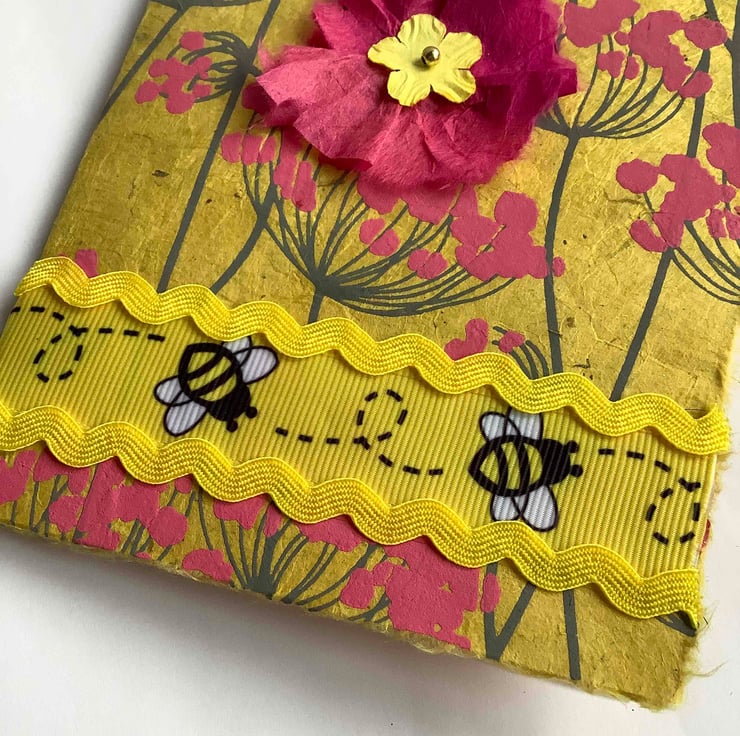 The final decoration consists of bumble bee ribbon with yellow braiding. In the centre there is a pink and yellow flower with a gold bead.