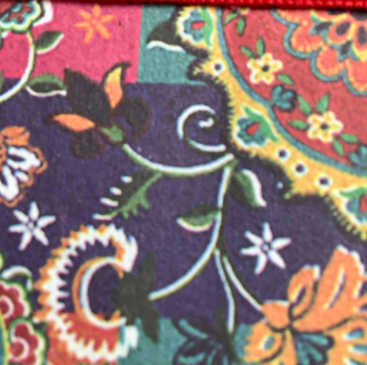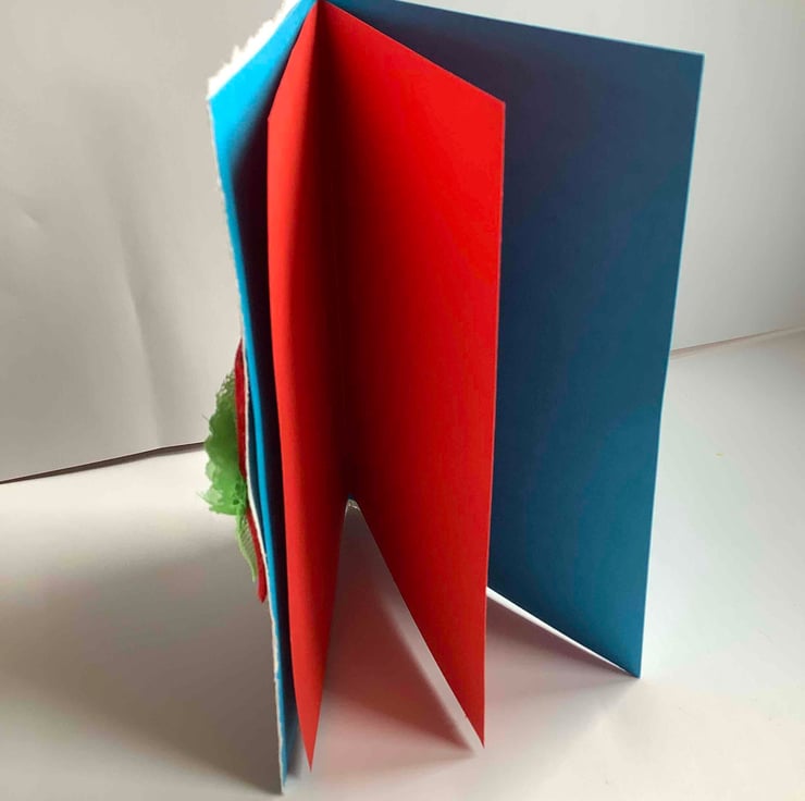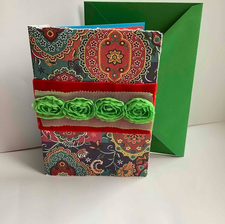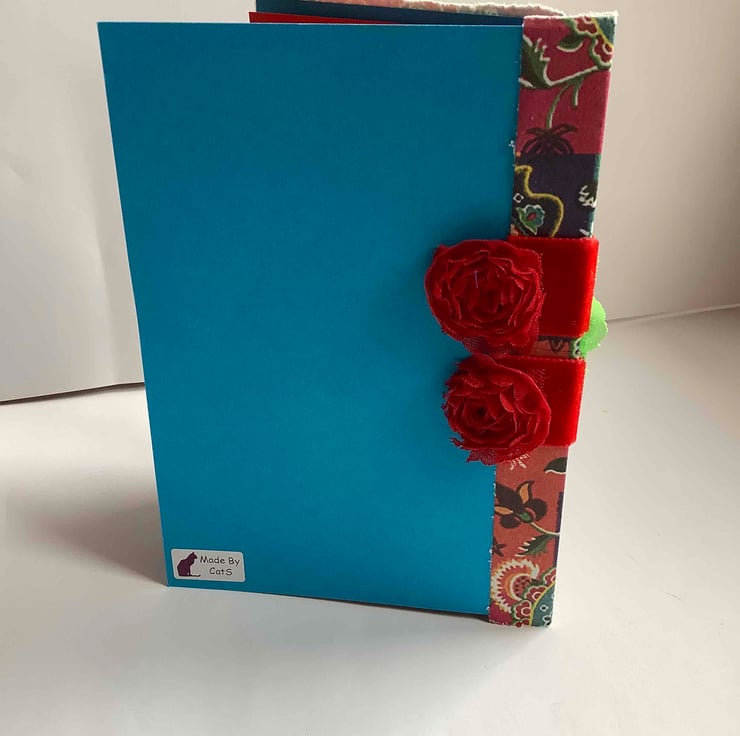 This card is part of the BRIGHT N CHEERY collection. The card itself is blue(and green envelope) with a red insert which is blank for your own message. A multi coloured rich pattern paper covers the front of the card.