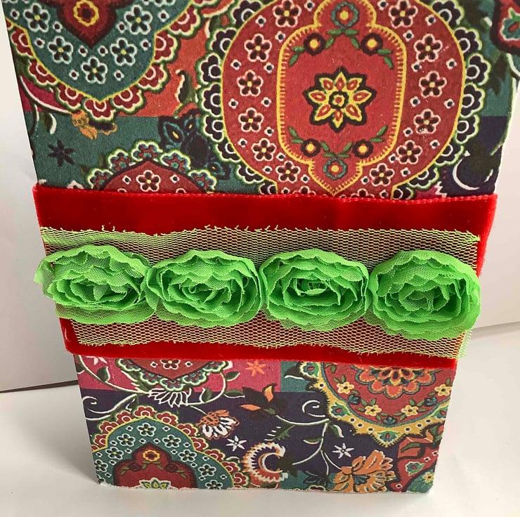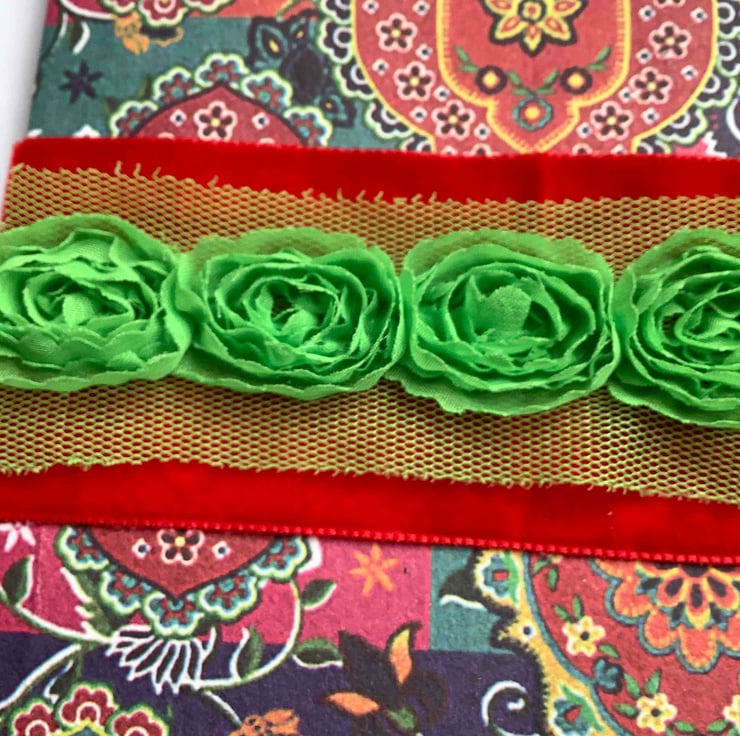 The final decoration consists of red velvet ribbon with a line of 4 green flowers on netting In the centre.