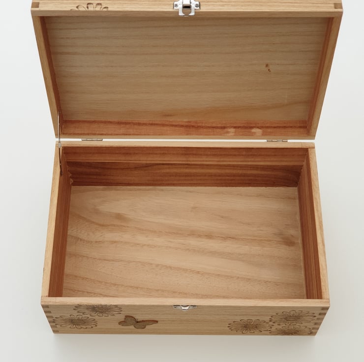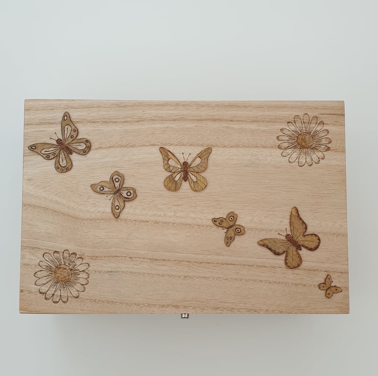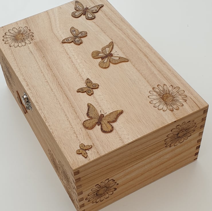 Beautiful butterfly and daisies design wooden storage box. The box has been handburnt using pyrography with daisies on each of the sides and wooden handburnt butterfly embellishments have been added to the top and front. A hint of paint has then been added and the box has been oiled for a natural look and protection. Pretty storage to add to your home which can be left on show.