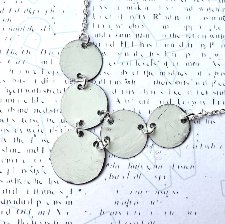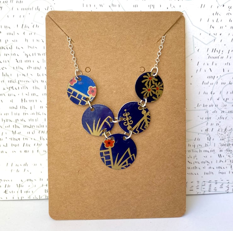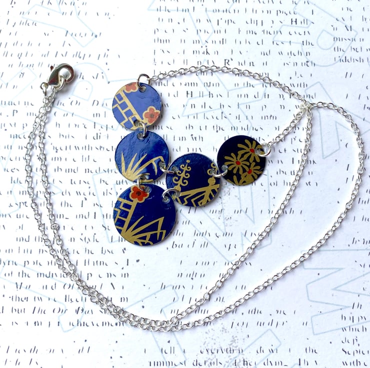 This necklace is made up of five discs which have been hand cut from a vintage Daher tin dish. Each disc features a section of an oriental garden scene in a muted gold on a navy blue background with hints of red. They have been smoothed around the edge, linked together with silver plated rings and hung on a fine silver plated chain. A truly unique and delicate necklace!