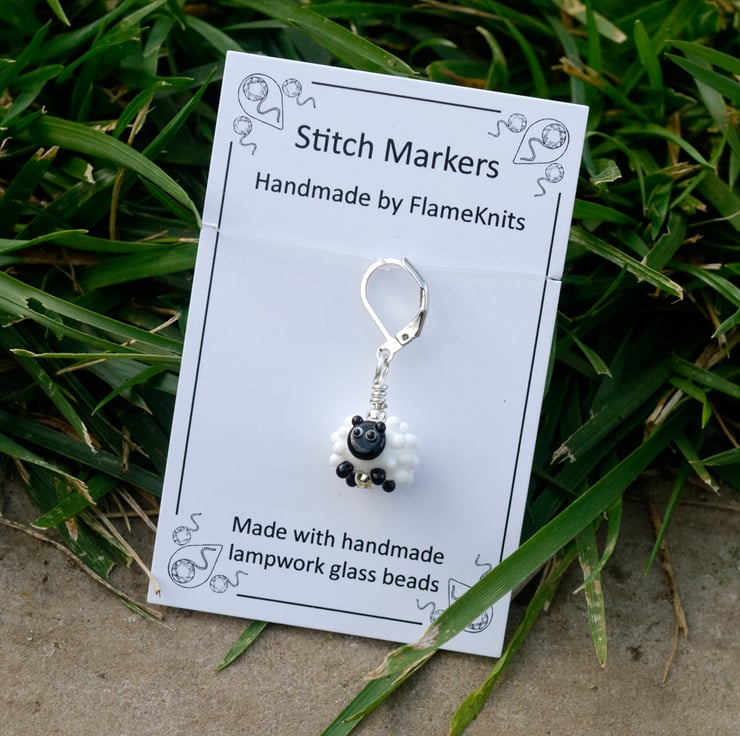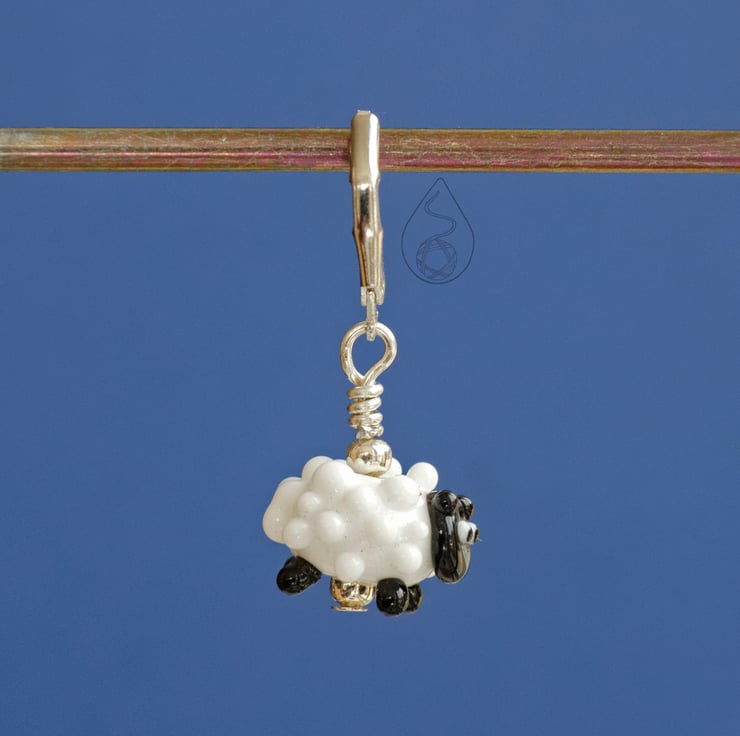 A tiny handmade glass sheep stitch marker. This one is white with black face and legs, much like the Suffolk breed of sheep which is always a favourite as I grew up and still live in Suffolk.