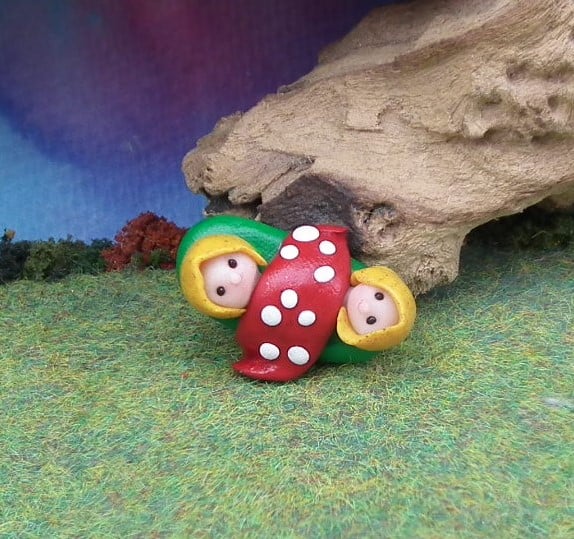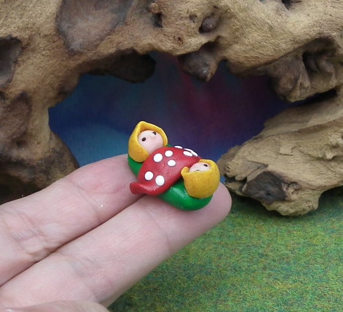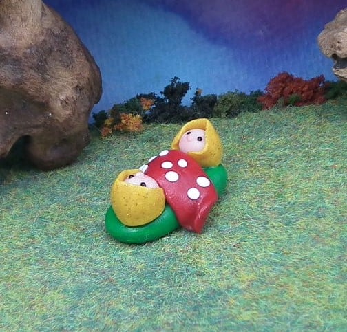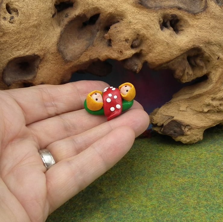 Sweet Gnome Babies snugly tucked 'top-to-tail' in a fly agaric crib on green base ...