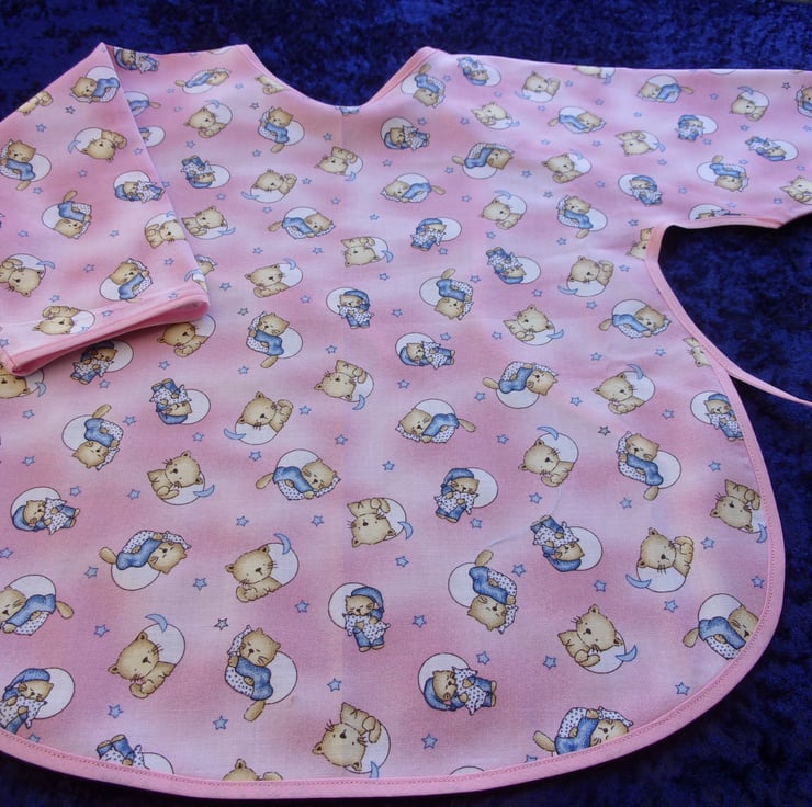 The design of the fabric used is sleepy cats in blue baby grows in circles on a pink background and is edged with a contrasting pink bias binding.