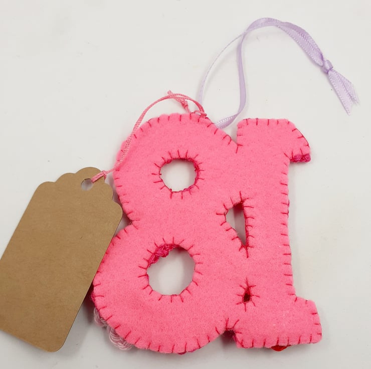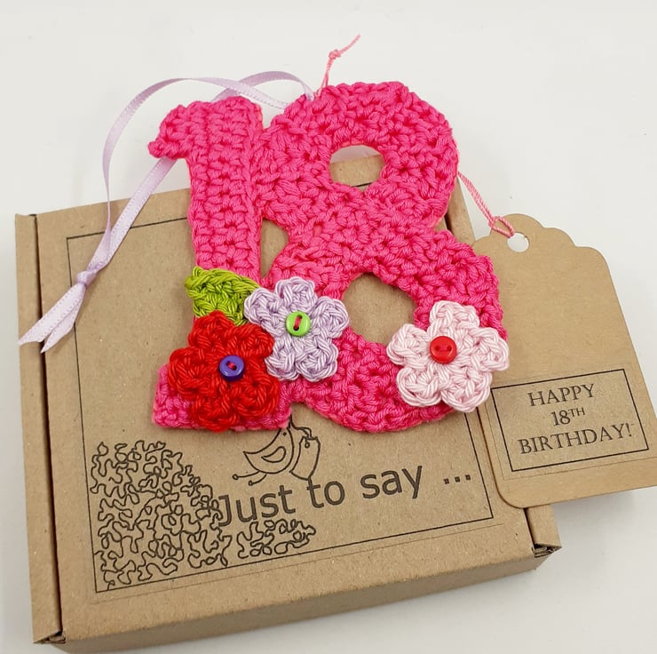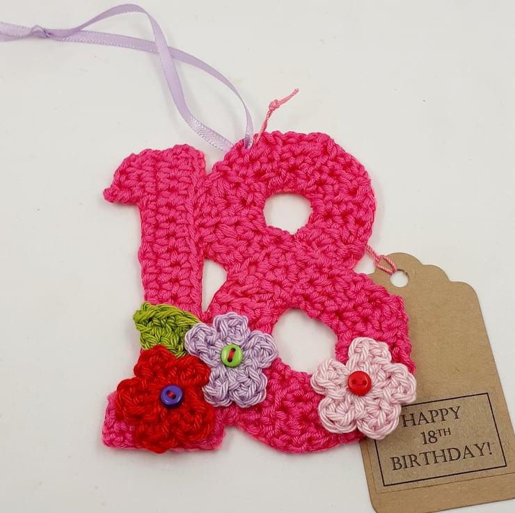 This pretty number 18 hanging decoration would make a lovely alternative to a traditional card. It is crocheted in cotton and then backed with stiffened craft felt. The flowers have a tiny coloured button at their centre. There is a narrow ribbon hanging loop and a tag which reads, Happy 18th Birthday. Please note that I am very happy to exchange this tag for one with wording of your choice. The number 18 measures approximately 9cm tall by 8.5cm wide. The hanger comes wrapped in tissue in a labelled PIP box all ready to be given or posted on.