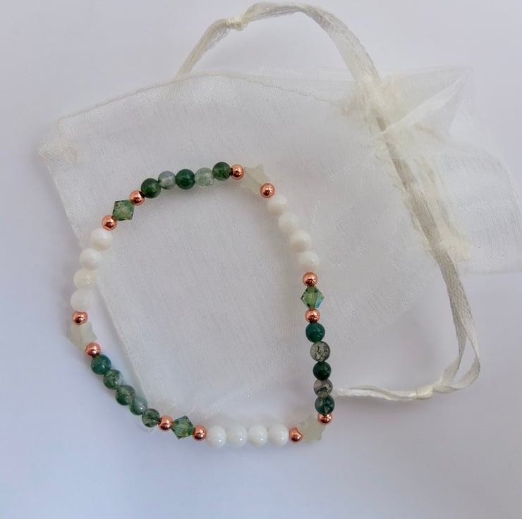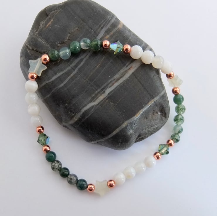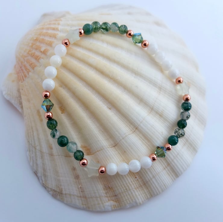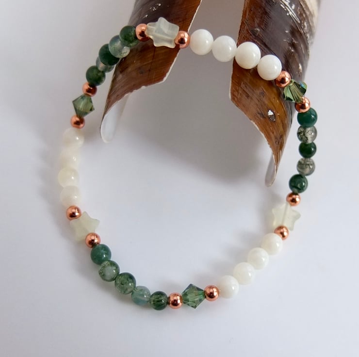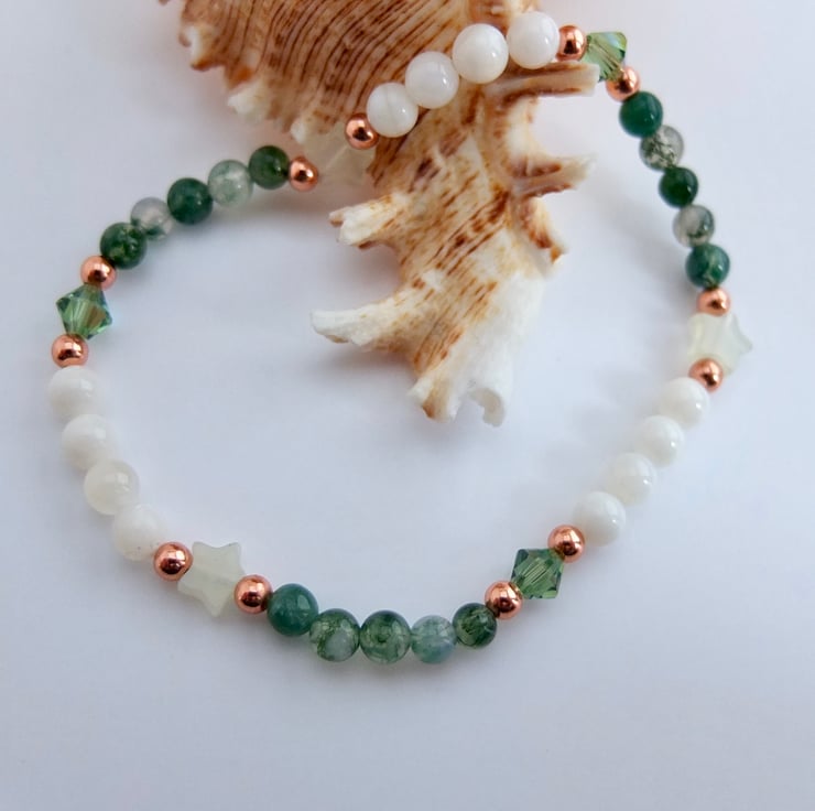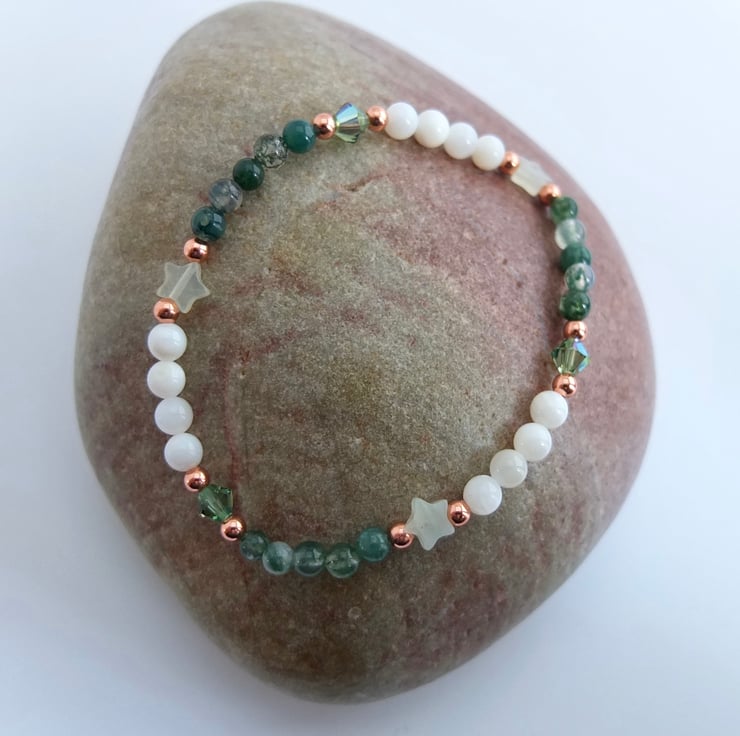 These are separated with pale green jade stars and sparkly Swarovski crystals in a colour called "erinite shimmer", and highlighted with small copper rounds.