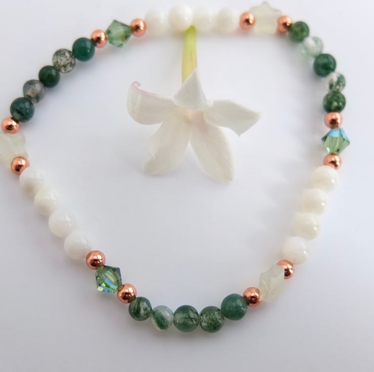 Contrasting beads of beautiful, forest green moss agate, and white shell that glint with mother of pearl.
