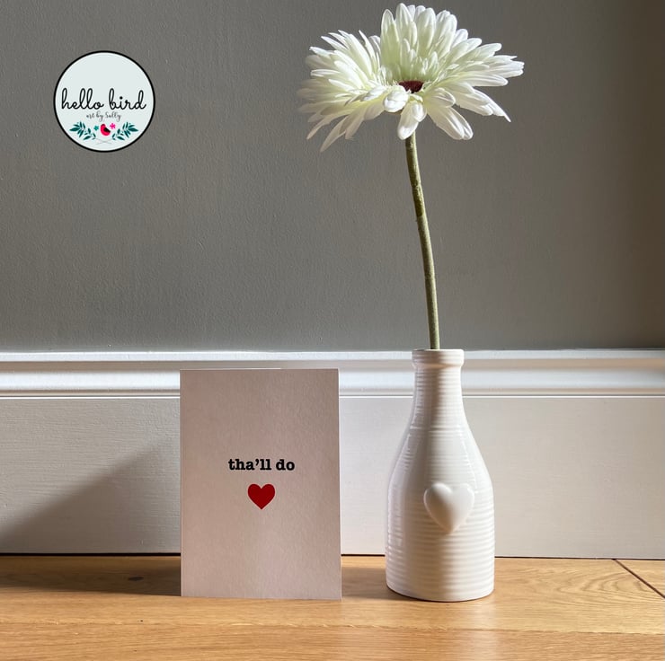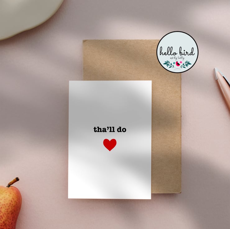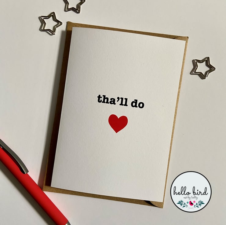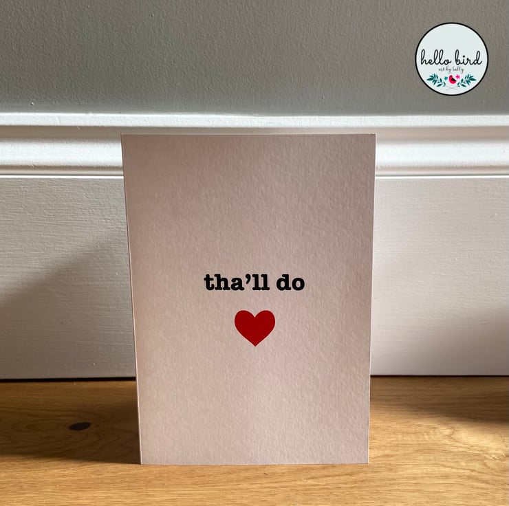 Tell someone you love them in that classic Yorkshire style! Original design greeting card featuring classic Yorkshire dialect 'Tha'll do' - translation 'you'll do!' Features a bright red love heart underneath the writing. Perfect for so many occasions - birthdays / anniversaries / valentines / just because.