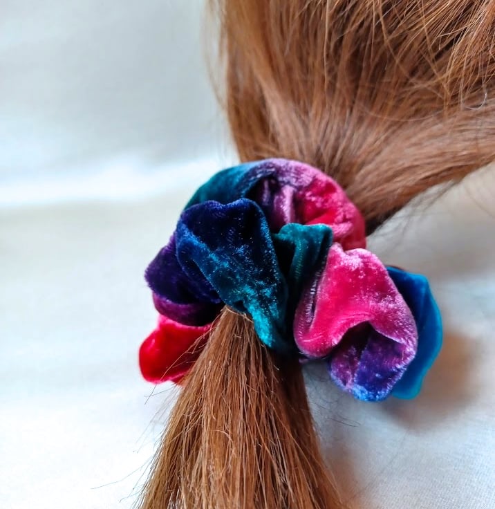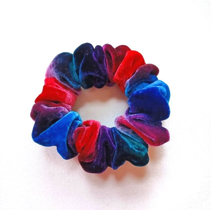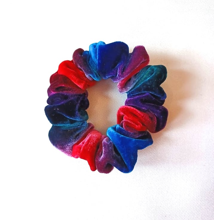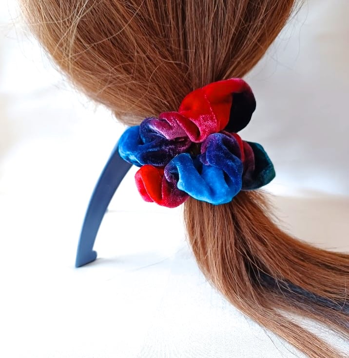 Hand painted ruched velvet hairband, scrunchie, multi ombre vibrant richly painted colours. Opulent sophisticated quality hair accessory. 11cm full width, depth 4cm.
