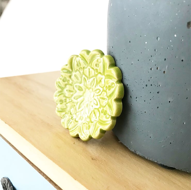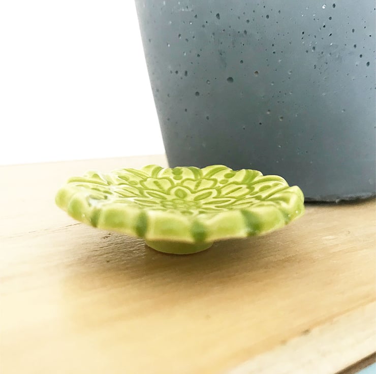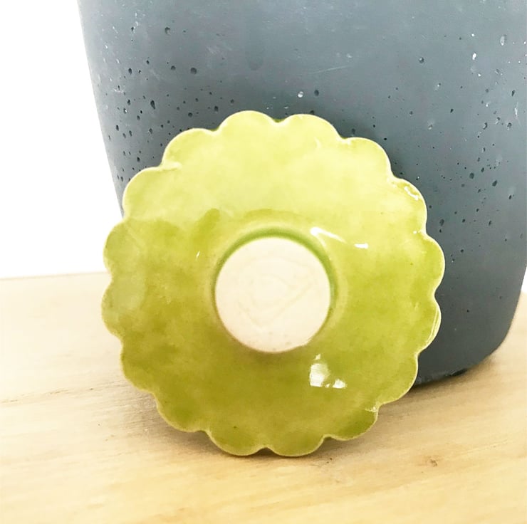 This teeny, little dish, is glazed in a green, glossy glaze. It is made from white earthenware clay and fired to a top temperature of 1100 degrees, so it is nice and strong. Dish measures 4cm across x 1cm deep. Finished in a food safe glaze.