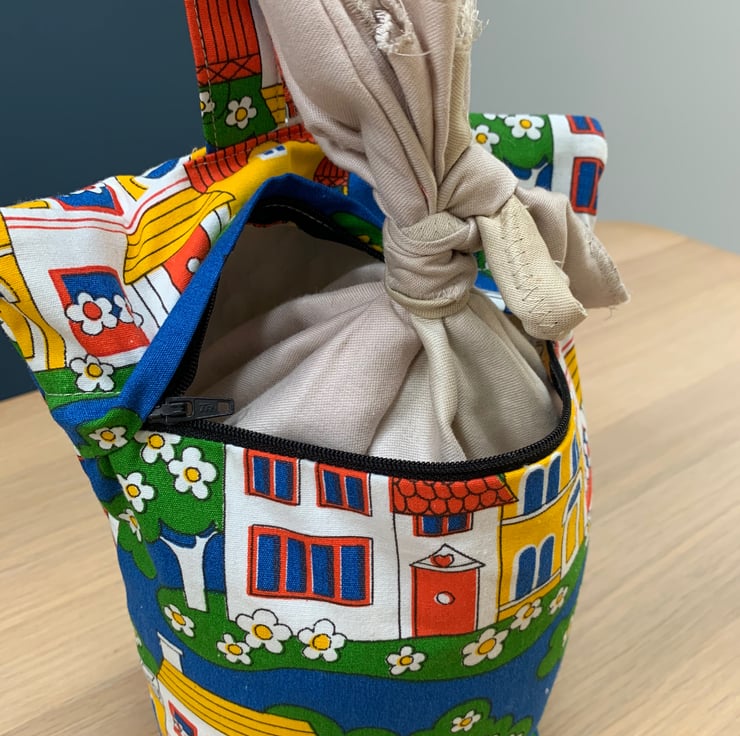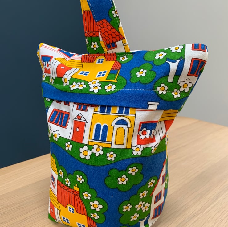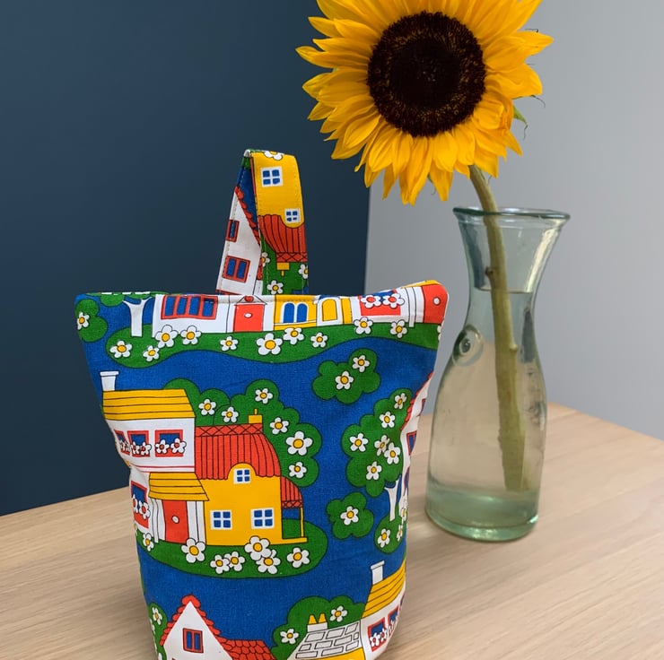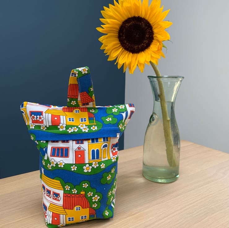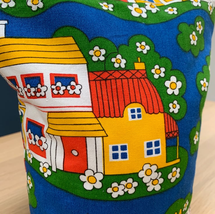 Cute doorstop made from vintage Daisy Walk cotton fabric in bright primary colours. Daisy Walk was a children’s fabric for Jonelle in the 1970s.