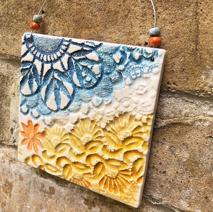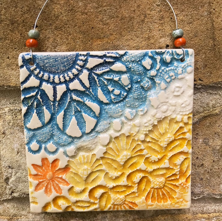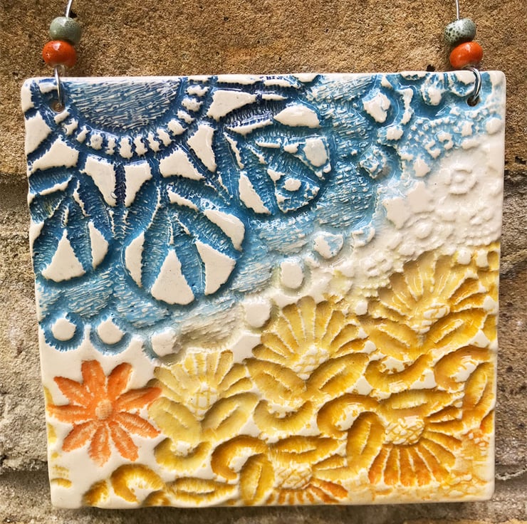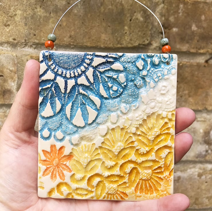 This little ceramic plaque is made from white earthenware clay and embossed with pattern and colour in a sea theme. It has been fired twice and finished with a glossy glaze for a lovely smooth finish. It measures 10cm x 10cm and hangs from a silver metal wire finished with small ceramic beads. Decorated on the front only.