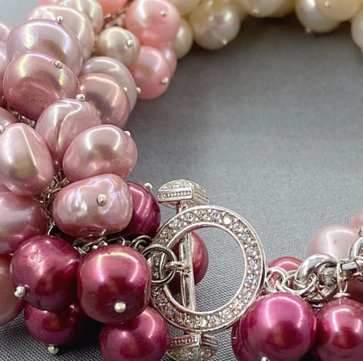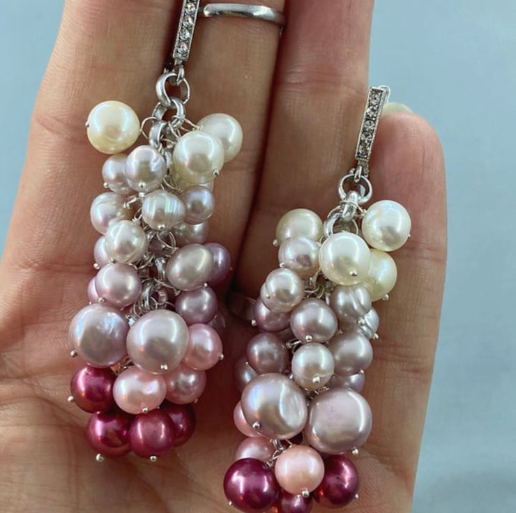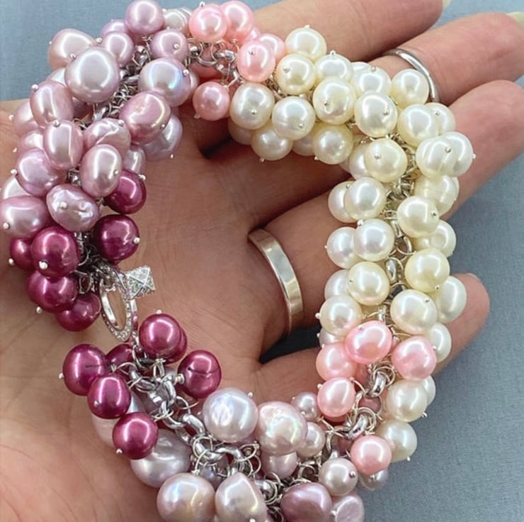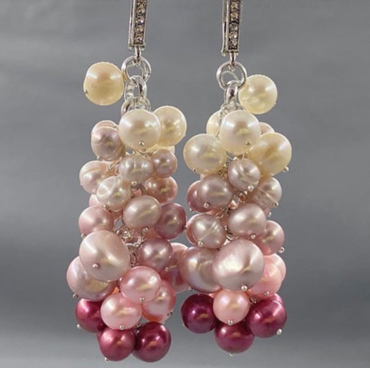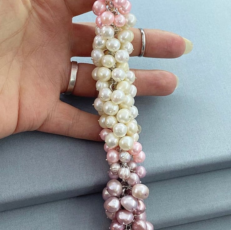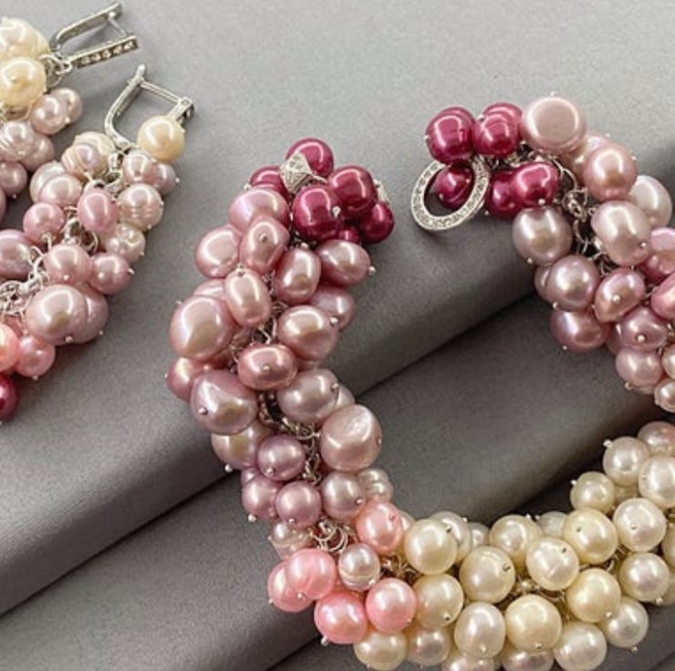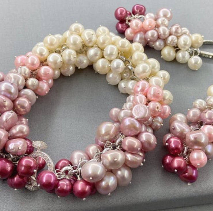 A very high end set comprising of a bracelet and earrings set featuring ivory and various shades of pink cultured pearls in an array of sizes. Each pearl has been carefully wire wrapped one by one with sterling silver.