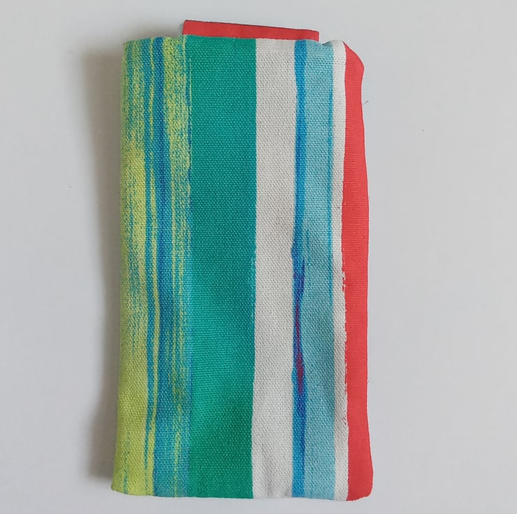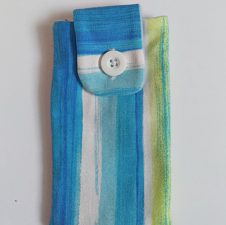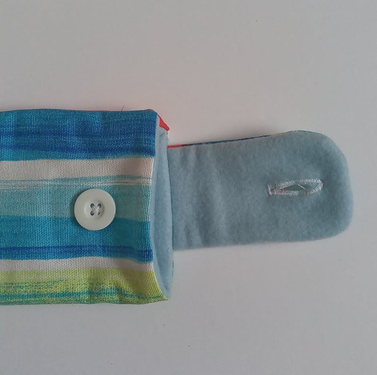 This is a case suitable for glasses or sunglasses with a light blue fleece lining and a button closure.