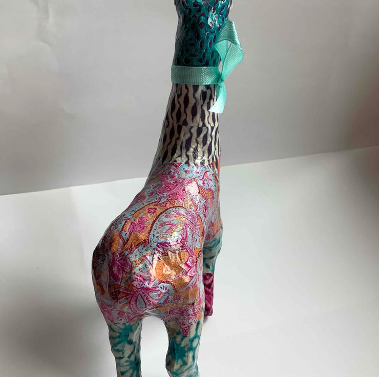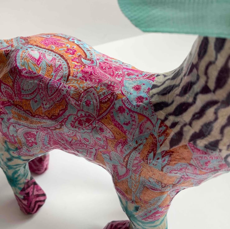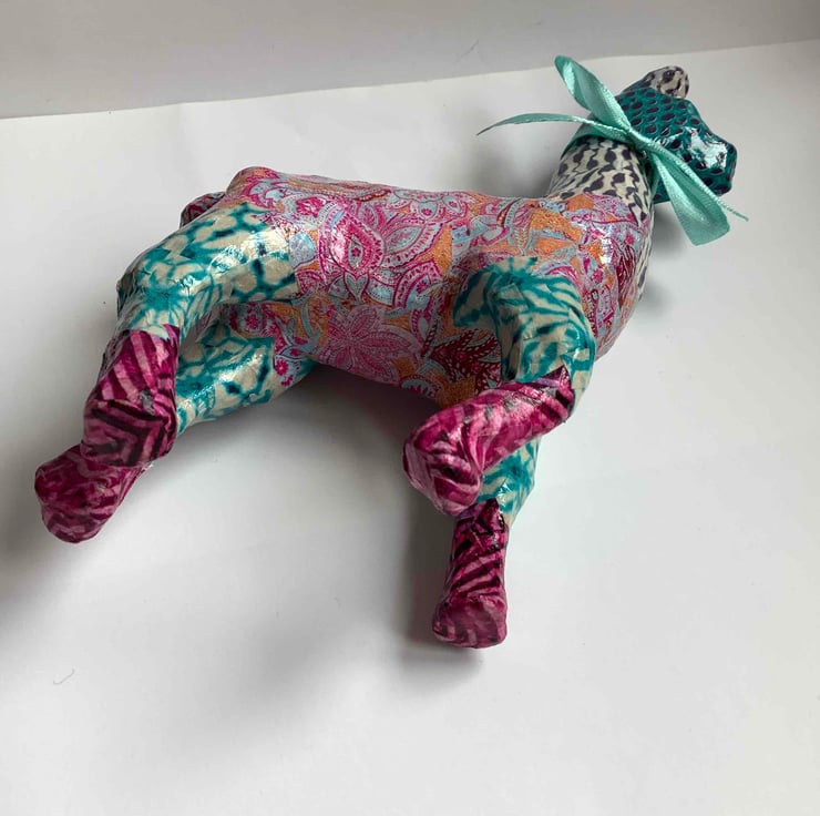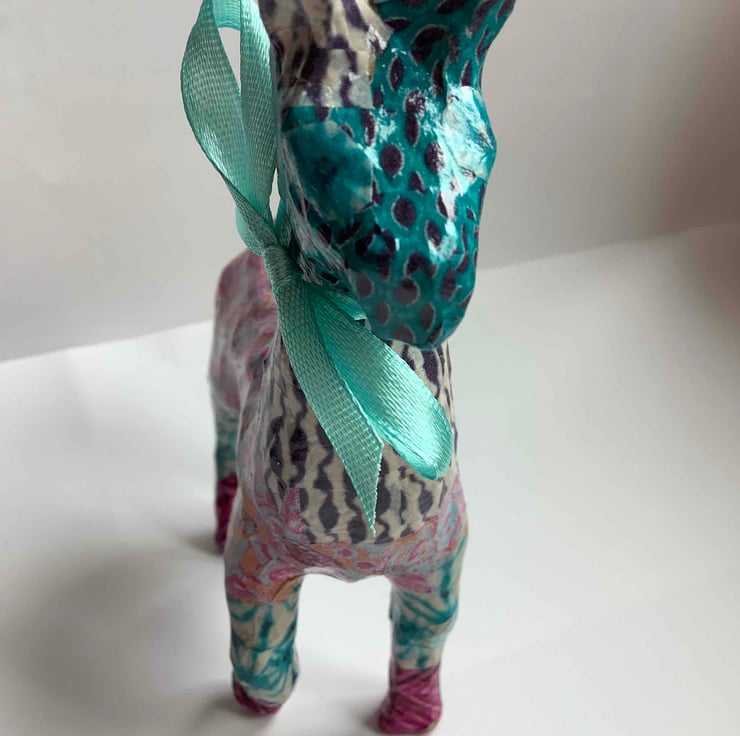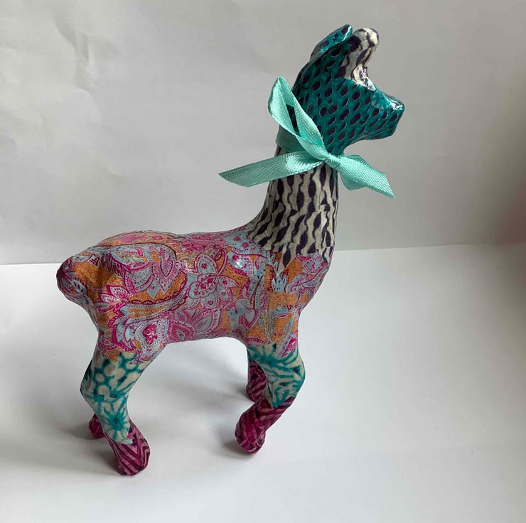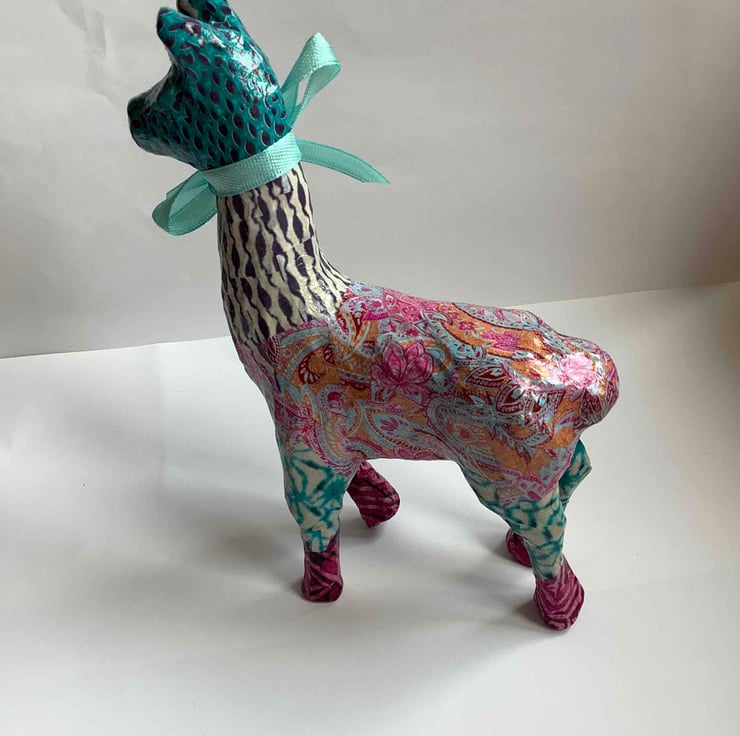 Llamas are so cute and this one is no exception. He is made of papier mache and Decopatched with a variety of coloured papers and finally varnished.