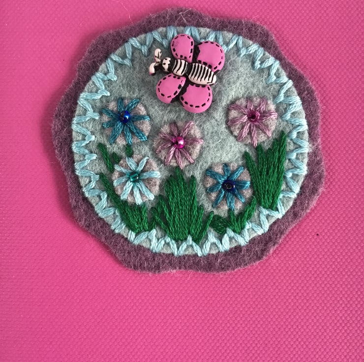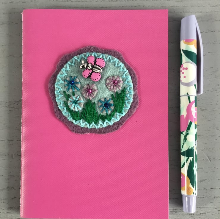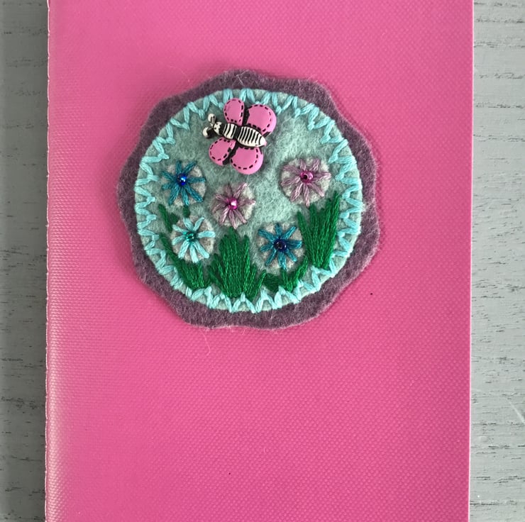 A pink butterfly button flutters over flowers on the pink front cover of this notebook. She is surrounded by hand embroidered Lazy-Daisy, Fly and Long and Short Stitches, dotted with seed beads on a background of felt in a palette of heather, grey, pink and green colours.