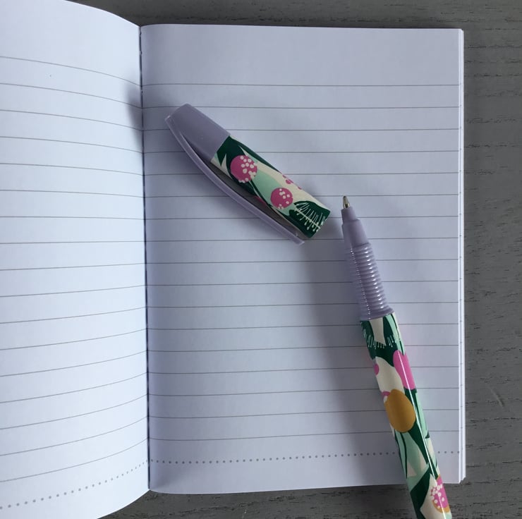 A floral pen with black ink compliments the embroidery on this notebook. This A6 notebook (4 by 6 inches) has 40 lined pages to write in.