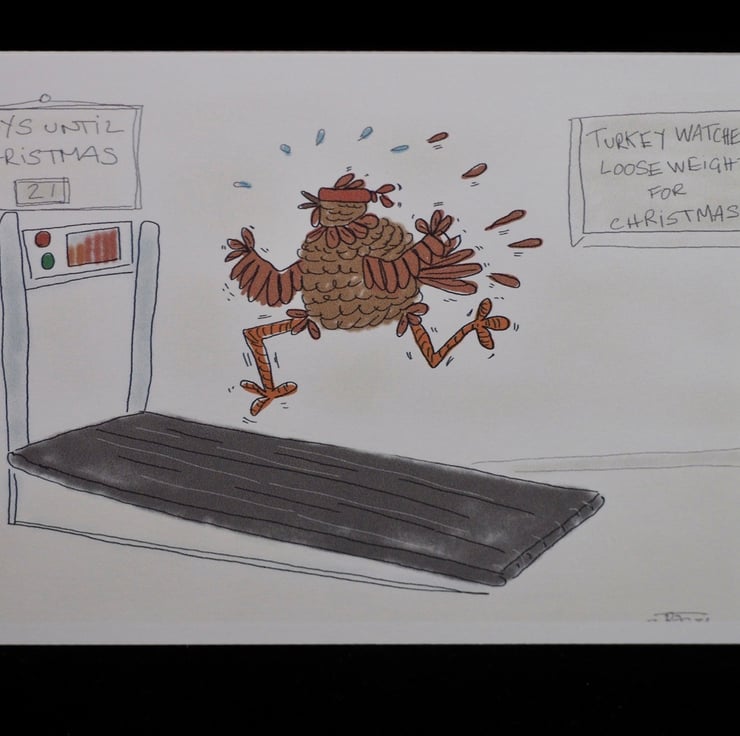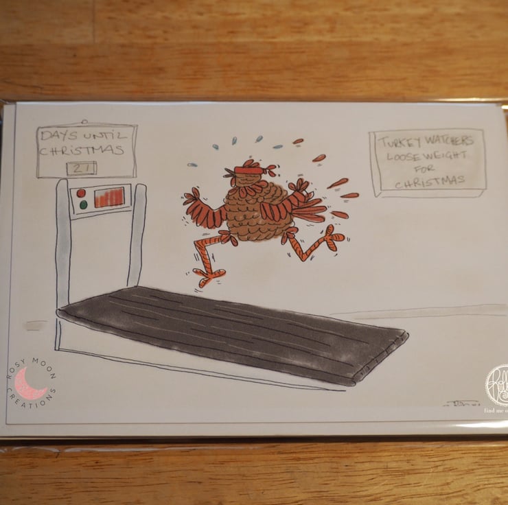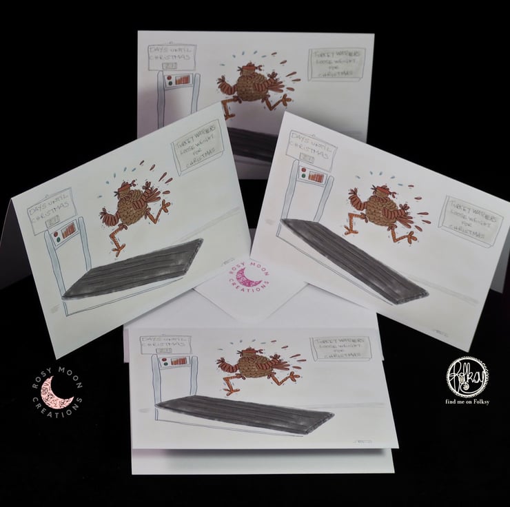 This fun set of four 18x12cm Christmas cards have a hand drawn Christmas Turkey trying to shift a few pounds before the big day. The design is hand drawn by myself and printed onto quality card.