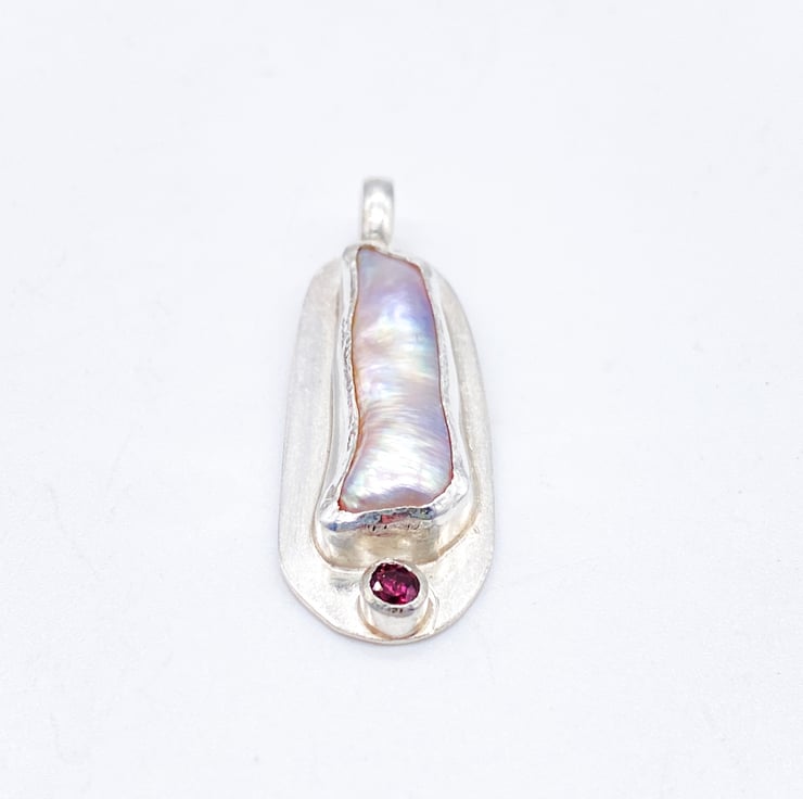 Lilac Biwa pearl, has been wrapped in sterling silver added below is a beautiful bright pink faceted Tourmaline. Making this one of a kind piece of jewellery.