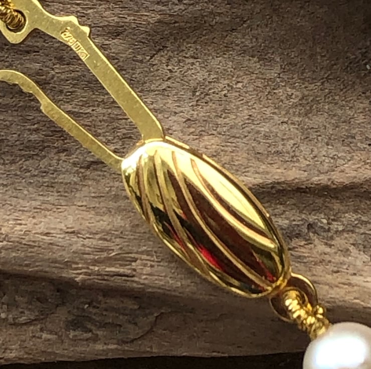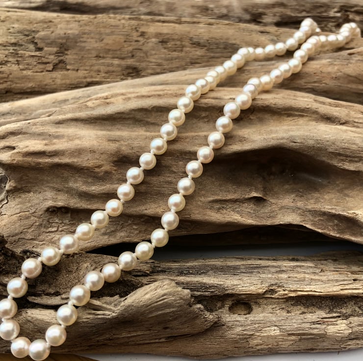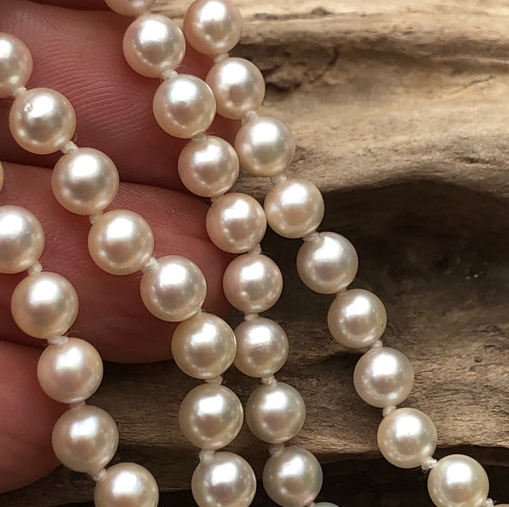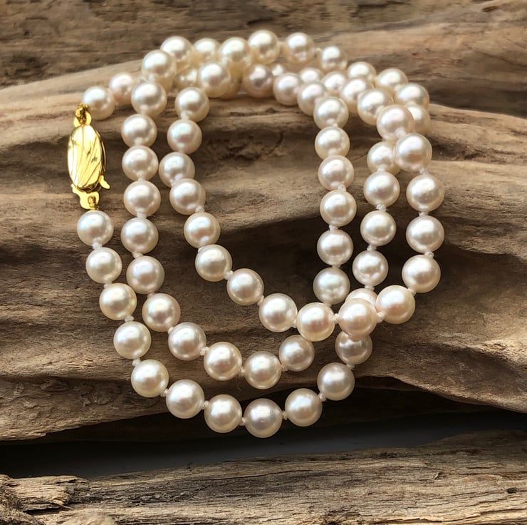 5-5.5mm white Akoya pearls threaded knotted on to a 9ct yellow gold safety snap.