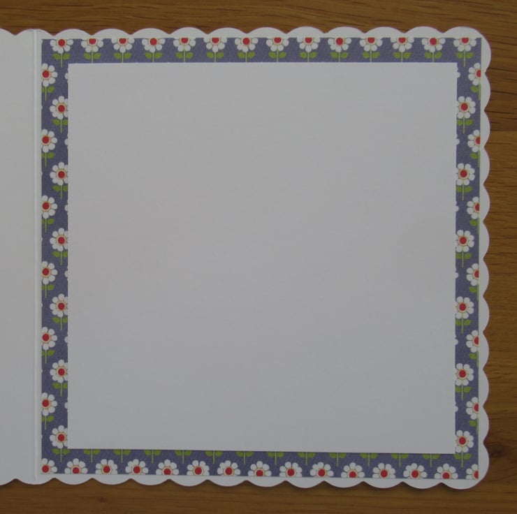 This lovely image of a bear dressed as a ladybird has been printed then hand coloured by me, to coordinate with the backing papers. The image has been cut in an oval shape using plain and decorative dies and sits upon several layers of decorative papers and embossed cardstock. Silver foil card has been used for that touch of sparkle and the inside of the card is finished to coordinate with the front.